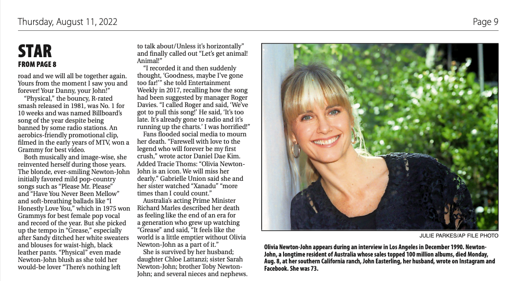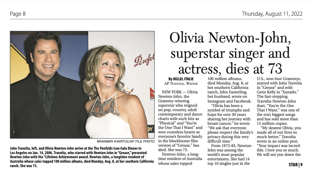 NEW YORK - Olivia Newton-John, the Grammy-winning superstar who reigned on pop, country, adult contemporary and dance charts with such hits as Physical