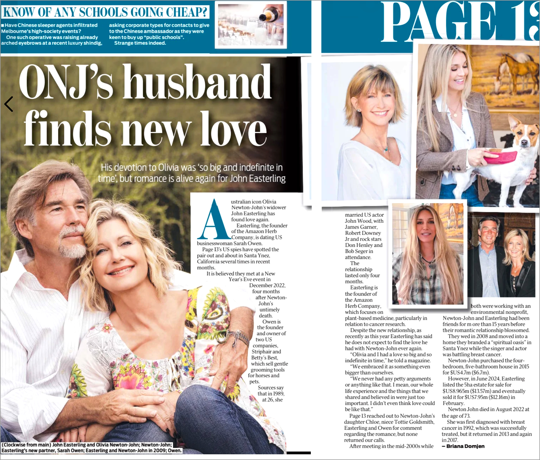 Australian icon Olivia Newton-John’s widower John Easterling has found love again. Easterling, the founder of the Amazon Herb Company, is dating US businesswoman Sarah Owen. Page 13’s US spies have spotted the pair out and about in Santa Ynez, California several times in recent months.
