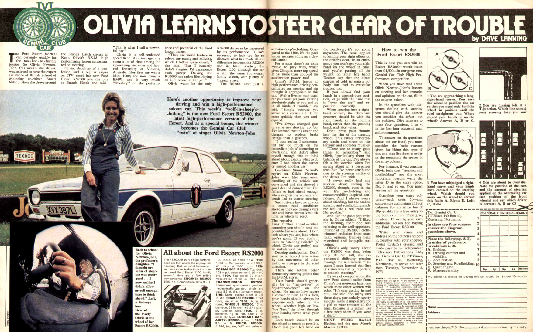 The Ford Escort RS2000 can certainly qualify for the too hot-to-handle league. So Olivia Newton-John, this week's star driver, was relieved to have the expert assistance of British School of Motoring co-driver Stuart Niland when she drove around the Brands Hatch circuit in Kent. Olivia's B.S.M. high performance lesson concentrated on steering.