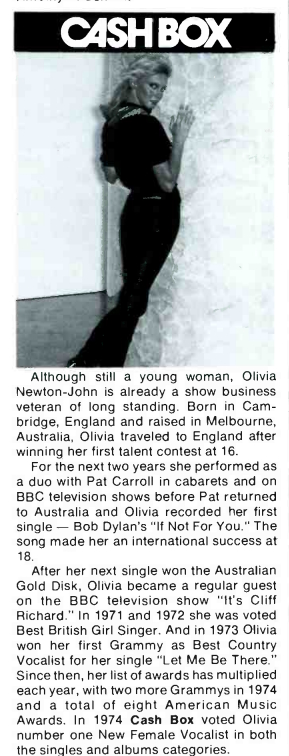 Since then, her list of awards has multiplied each year, with two more Grammys in 1974 and a total of eight American Music Awards. In 1974 Cash Box voted Olivia number one New Female Vocalist in both the singles and albums categories.
