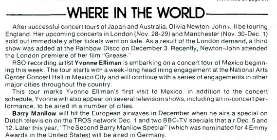 packages by Barry Manilow and Steve Miller Band which entered the chart at #50 bullet and #86 bullet respectively. Olivia Newton-John's new album Totally Hot