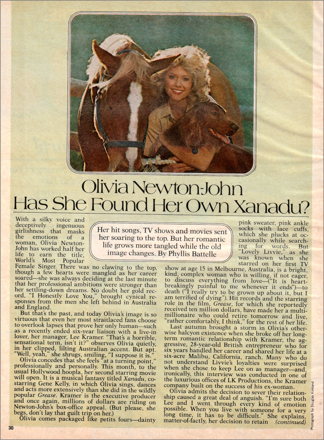 professionally and personally. This month, to the usual Hollywood hoopla, her second starring movie will open. It is a musical fantasy titled Xanadu, co-starring Gene Kelly, in which Olivia sings, dances and acts more extensively than she did in the wildly popular Grease. Kramer is the executive producer and once again, millions of dollars are riding on Newton-John's box-office appeal. (But please, she begs, don't lay that guilt trip on her.)