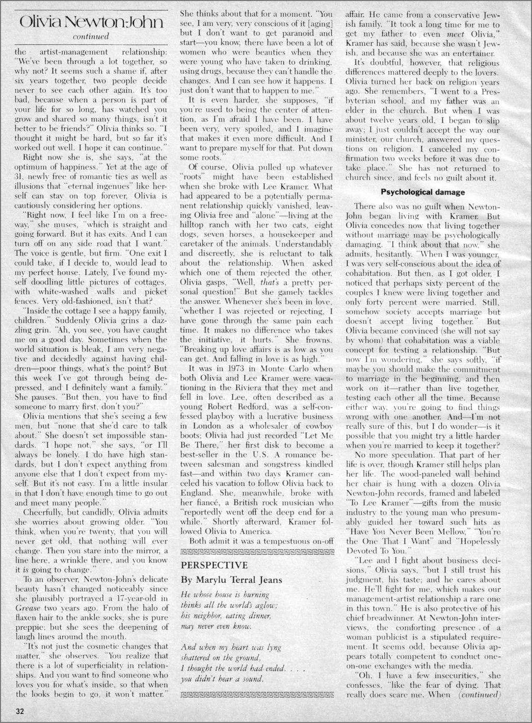 Last autumn brought a storm in Olivia's other wise halcyon existence when she broke off her long-term romantic relationship with Kramer, the aggressive, 28-year-old British entrepreneur who for six years handled her career and shared her life at a six-acre Malibu, California, ranch. Many who do not understand Livvie's loyalties were surprised when she chose to keep Lee on as manager - and, ironically, this interview was conducted in one of the luxurious offices of LK Productions, the Kramer company built on the success of his ex-woman.