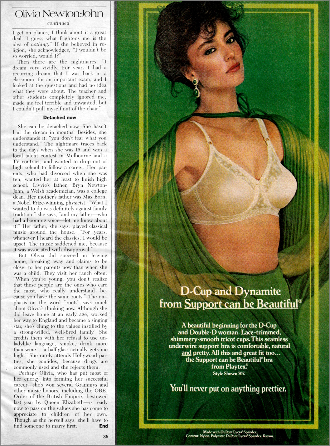 says much about Olivia’s thinking now. Although she did leave home at an early age, worked her way to England and became a singing star, she’s clung to the values instilled by a strong-willed, well-bred family. She credits them with her refusal to use unladylike language, smoke, drink more than wine — a half-glass actually gets me high.