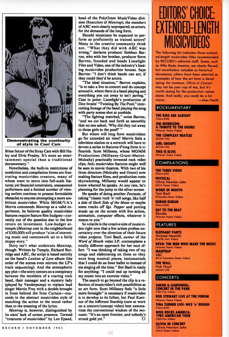 The following list indicates those extended-length musicvideo titles recommended by RECORD's editorial staff. Some, such as Who Rocks America, are clearly flawed, but nonetheless valuable as historical documents; others have been selected as examples of how the art form is developing for instance, Olivia In Concert may not be your cup of tea, but it's worth seeing for the production values alone. And really, you could do a lot worse. - Alan Hecht