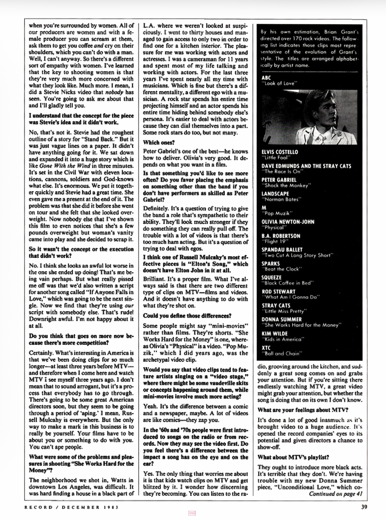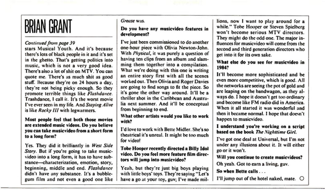 I've just been commissioned to do another one-hour piece with Olivia Newton-John. With Physical, it was purely a question of having ten clips from an album and slamming them together into a compilation. What we're doing with this one is writing an entire story first with all the scenes worked out. Then Olivia and Roger Davies are going to find songs to fit the piece. So it's gone the other way around. It'll be a thriller shot in the Caribbean and Australia next summer. And it'll be conceptual from beginning to end.