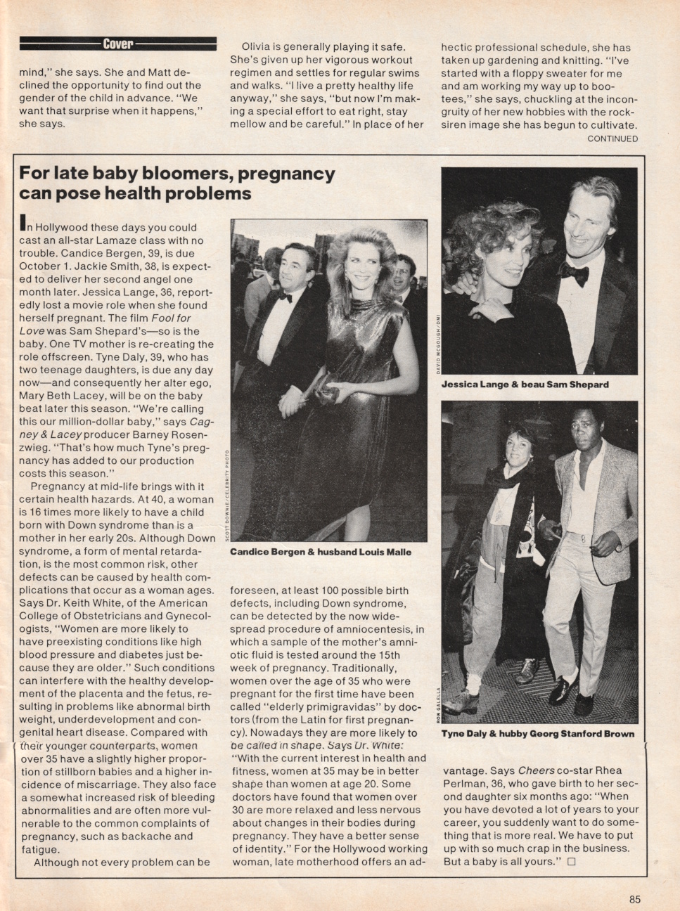 Olivia was not tempted to let her charm defy medical common sense. First-time moms over 35 (for whom amniocentesis is recommended to give advance warning of birth defects) have built-in anxieties. Like millions of career women who have put off getting pregnant (see box, page 85), Olivia has undergone amniocentesis and ultra-sound tests to put her mind at ease. I was sure everything was fine, but at my age you have to do it for peace of Cover