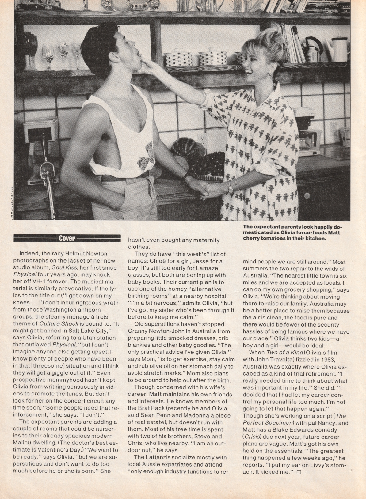 Though concerned with his wife's career, Matt maintains his own friends and interests. He knows members of the Brat Pack (recently he and Olivia sold Sean Penn and Madonna a piece of real estate), but doesn't run with them. Most of his free time is spent with two of his brothers, Steve and Chris, who live nearby. I am an out-door nut,