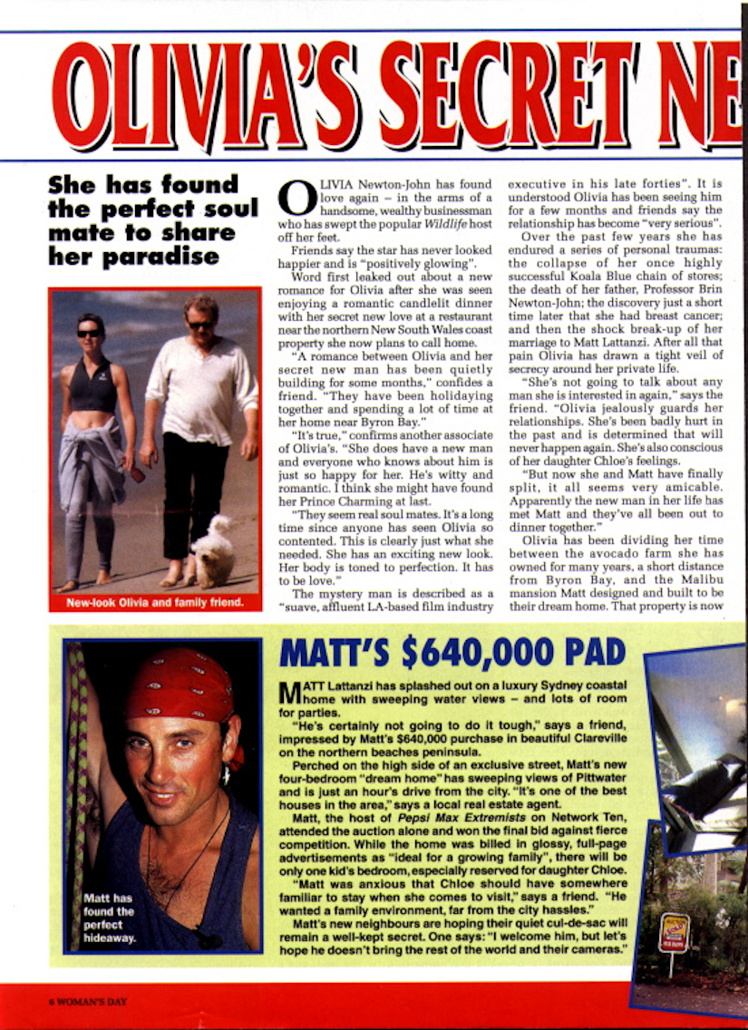 Over the past few years she has endured a series of personal traumas: the collapse of her once highly successful Koala Blue chain of stores; the death of her father, Professor Brin Newton-John; the discovery just a short time later that she had breast cancer; and then the shock break-up of her marriage to Matt Lattanzi. After all that pain Olivia has drawn a tight veil of secrecy around her private life.