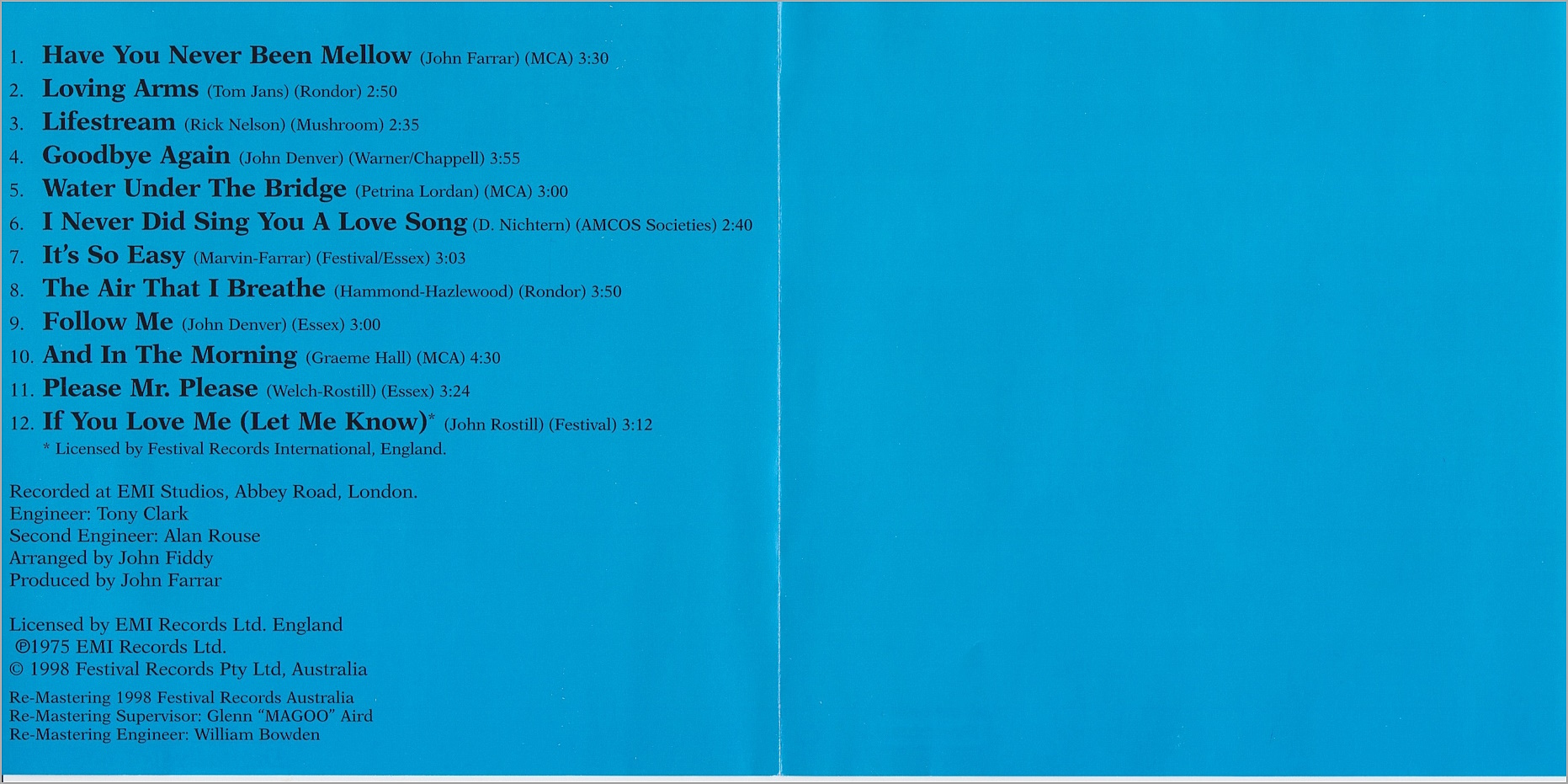 Olivia's albums, up to and including 1989's Warm and Tender album, were remastered and released onto CD in Australia back in 1998 by the Festival label.