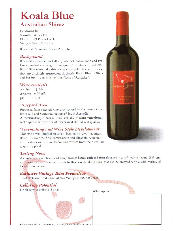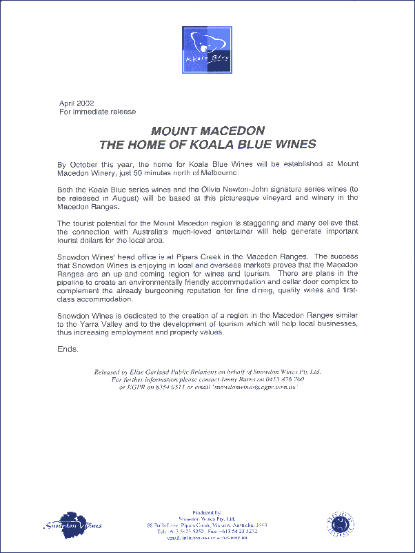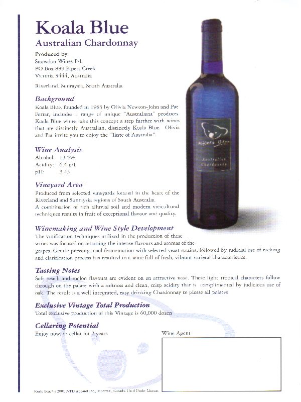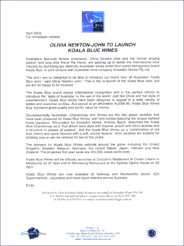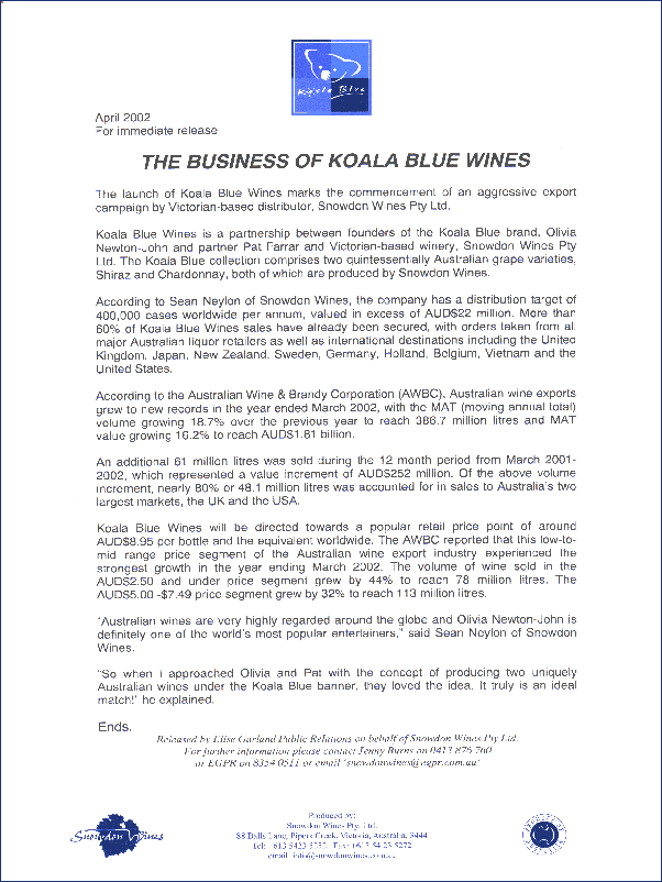 Press release for the launch of Koala Blue wine originally at URL http://www.koalabluewines.com.au