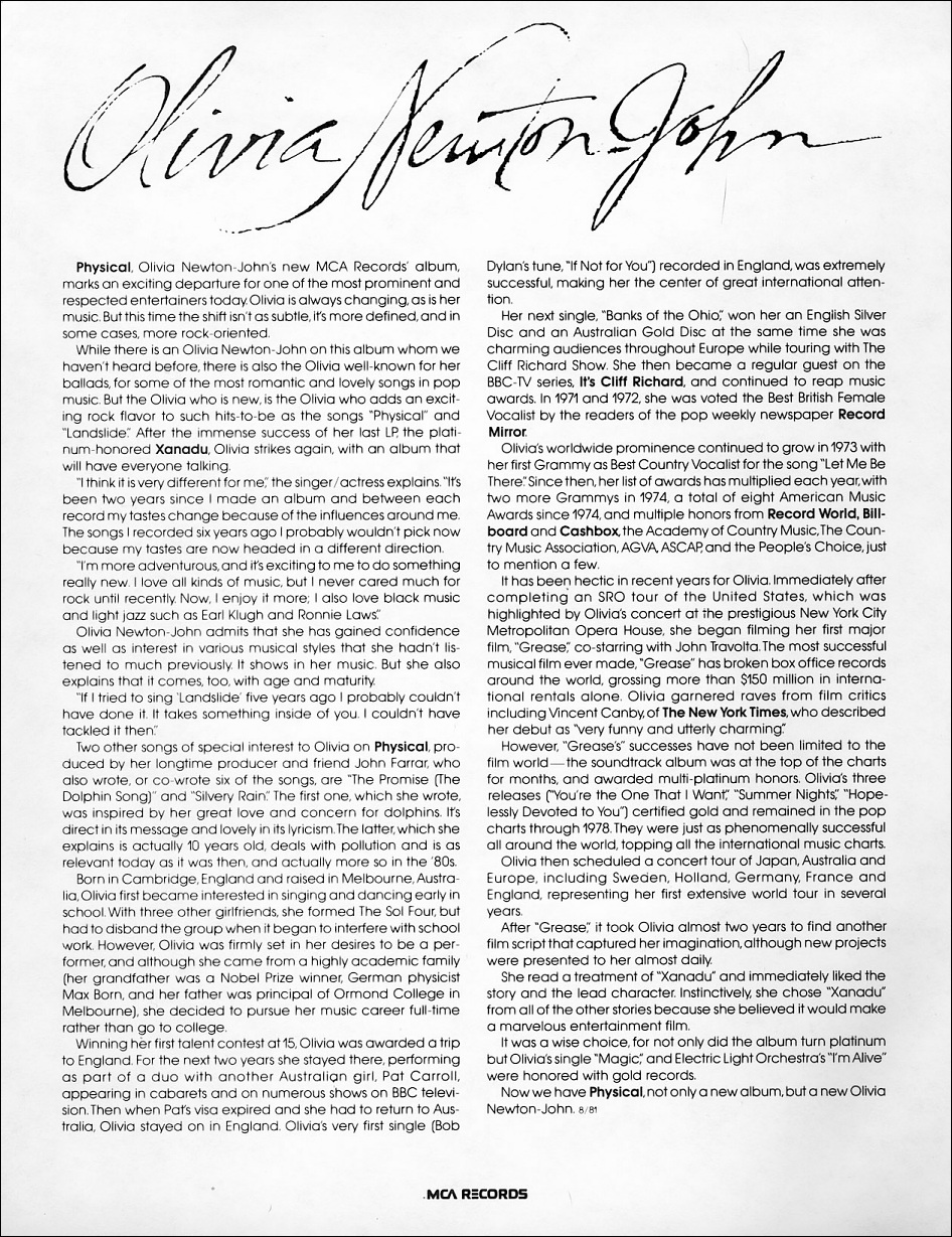 press kit for the 1981 album Physical