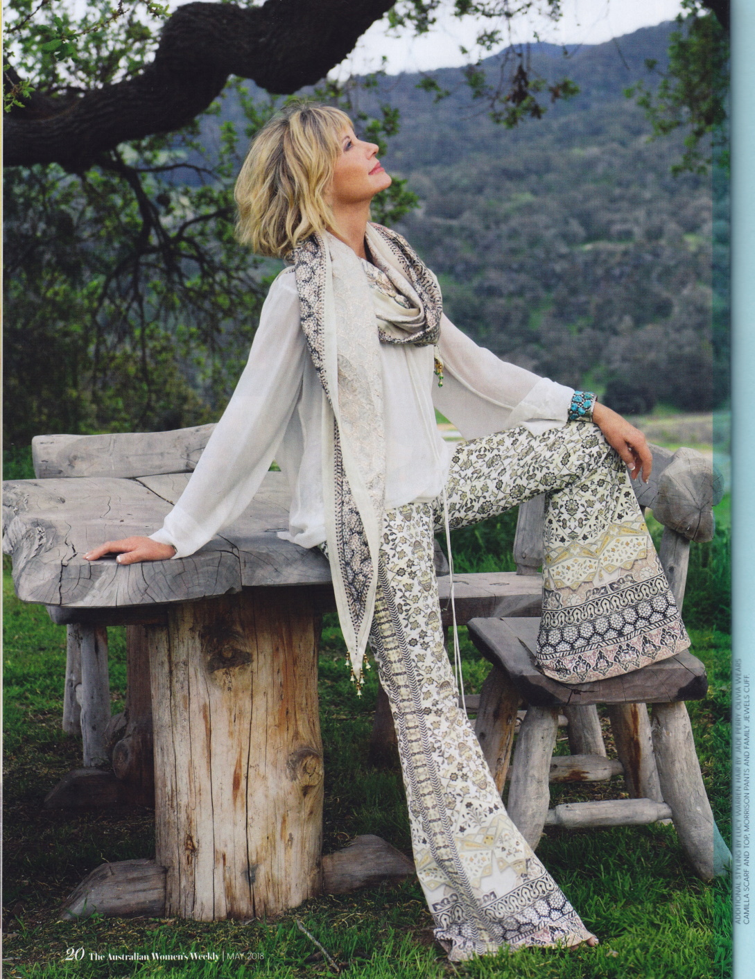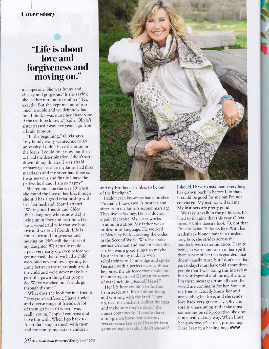 We take a walk in the paddocks. It’s hard to imagine that this year Olivia turns 70. She doesn’t look 70, not that I'm sure what 70 looks like. With her trademark blonde hair in a tousled, long bob, she strides across the paddock with determination. Despite being so warm and open in her spirit, there is part of her that is guarded, that doesn’t easily trust, but I don’t see that part today. I must have told about three people that I was doing this interview but word spread and during the time I’m there messages from all over the world are coming in for her.