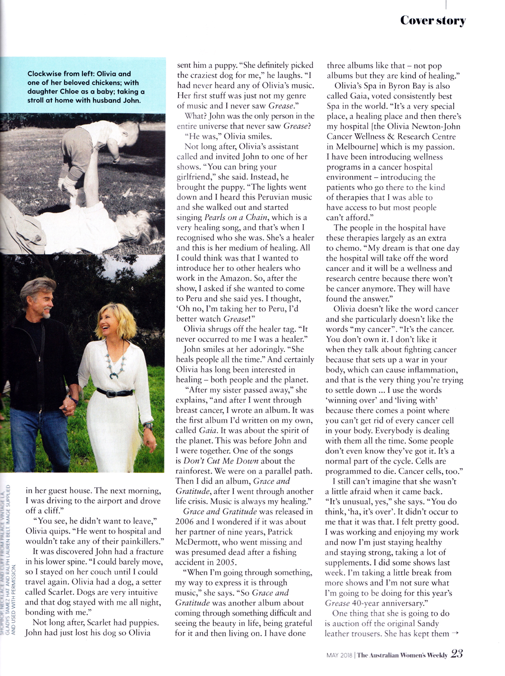 Olivia’s Spa in Byron Bay is also called Gaia, voted consistently best Spa in the world. It’s a very special place, a healing place and then there’s my hospital [the Olivia Newton-John Cancer Wellness & Research Centre in Melbourne] which is my passion. I have been introducing wellness programs in a cancer hospital environment - introducing the patients who go there to the kind of therapies that I was able to have access to but most people can’t afford.