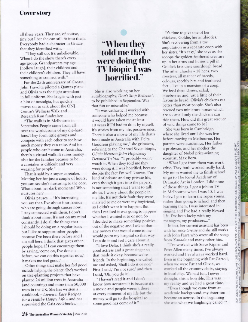 she grimaces, referring to the Channel Seven biopic, Olivia Newton-John Hopelessly Devoted To You. I probably won’t watch it. When they told me they were doing it, I was horrified, because despite the fact I’m well known, I’m kind of private and my private life, even though it gets into the papers, is not something that I want to talk about. I worry about the people in my life. It’s not their fault they were married to me or were my boyfriend, so I didn’t want it to happen. But then I realised it was going to happen whether I wanted it to or not. So I decided to make something positive out of the negative and I asked that any money that would come to me would go to my hospital so that way I can do it and feel I care about it.