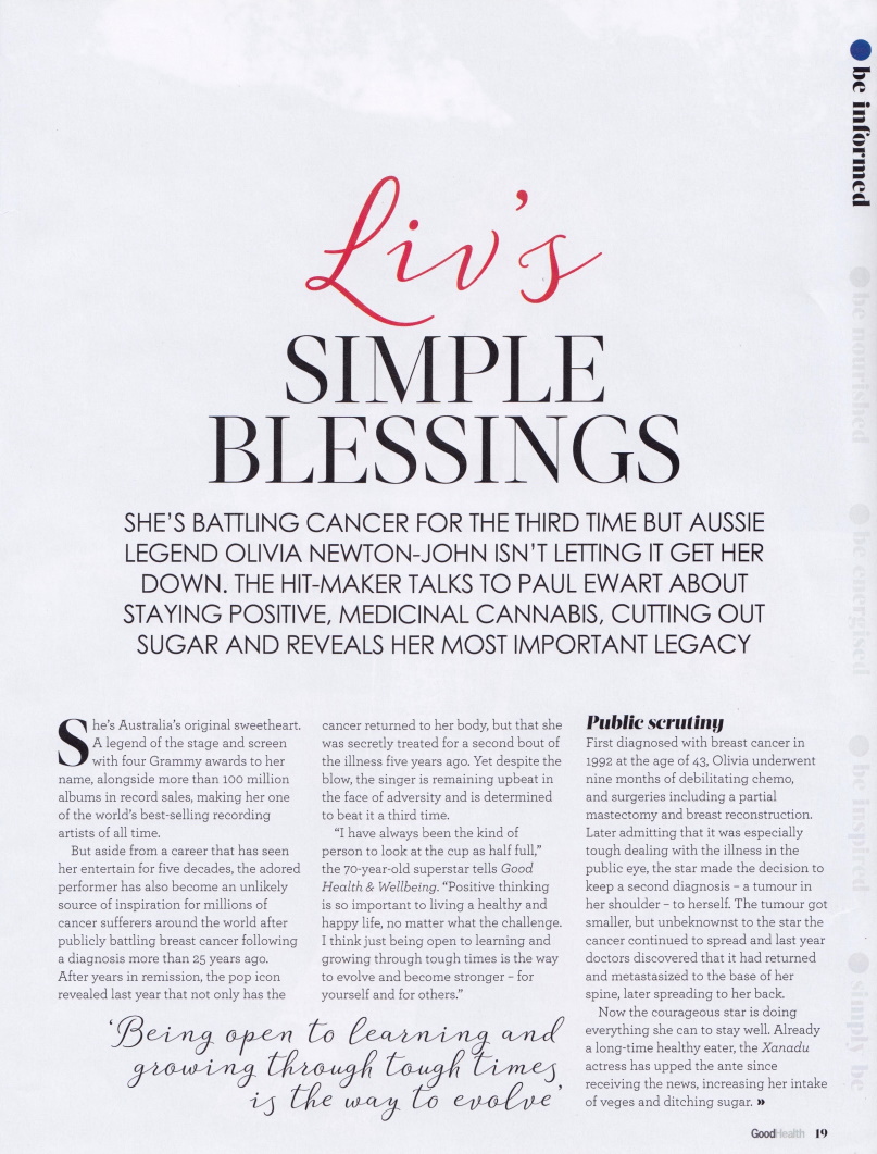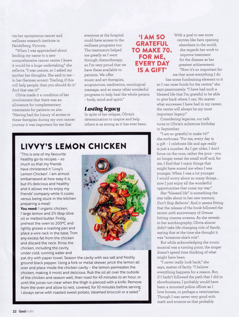 Now the courageous star is doing everything she can to stay well. Already a long—time healthy eater, the Xanadu actress has upped the ante since receiving the news, increasing her intake of veges and ditching sugar. I’ve always loved a variety of fruit and vegetables — I love roasting veges or eating them raw — and now I'm eating even more of them,