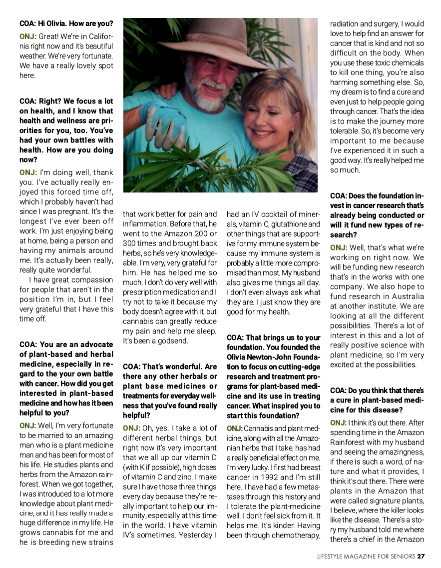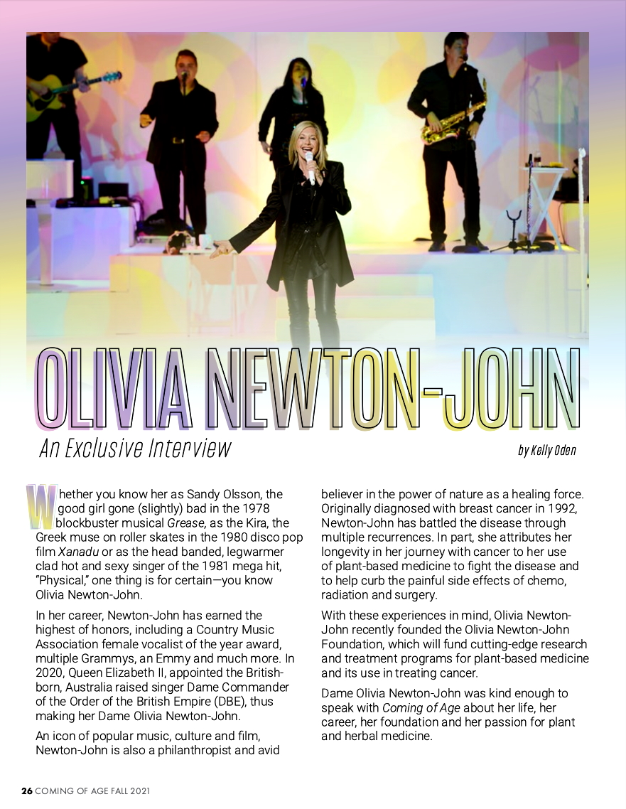 Dame Olivia Newton—John was kind enough to speak with Coming of Age about her life, her career, her foundation and her passion for plant and herbal medicine.