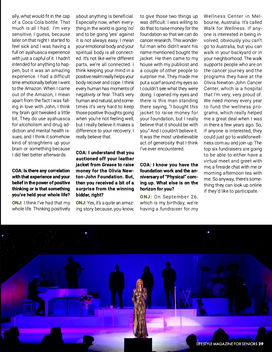 ONJ: On September 26, which is my birthday, we're having a fundraiser for my Wellness Center in Melbourne. Australia. It's called Walk for Wellness. If anyone is interested in being involved, obviously you can't go to Australia, but you can walk in your backyard or in your neighborhood. The walk supports people who are on the cancer journey and the programs they have at the Olivia Newton-John Cancer Center which is a hospital that I'm very, very proud of. We need money every year to fund the wellness programs which really helped me a great deal when I was in there a few years ago. So, if anyone is interested. they could just go to walkforwellness.com.au and join up. The top six fundraisers are going to be able to either have a virtual meet and greet with me, fireside chat with me or morning afternoon tea with me. So anyway. there's something they can look up online if they'd like to participate.