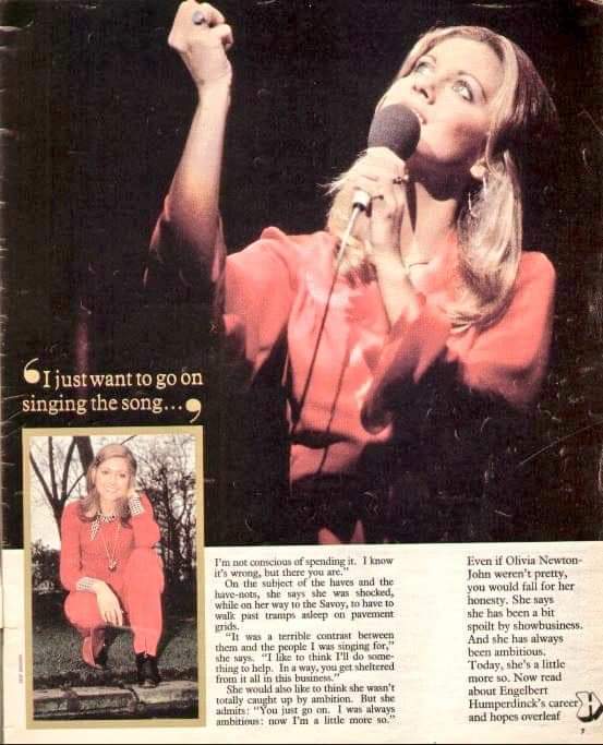 Even if Olivia Newton-John weren't pretty, you would fall for her honesty. She says she has been a bit spoilt by showbusiness. And she has always been ambitious. Today, she's a little more so. Now read about Engelbert Humperdinck's career and hopes overleaf.