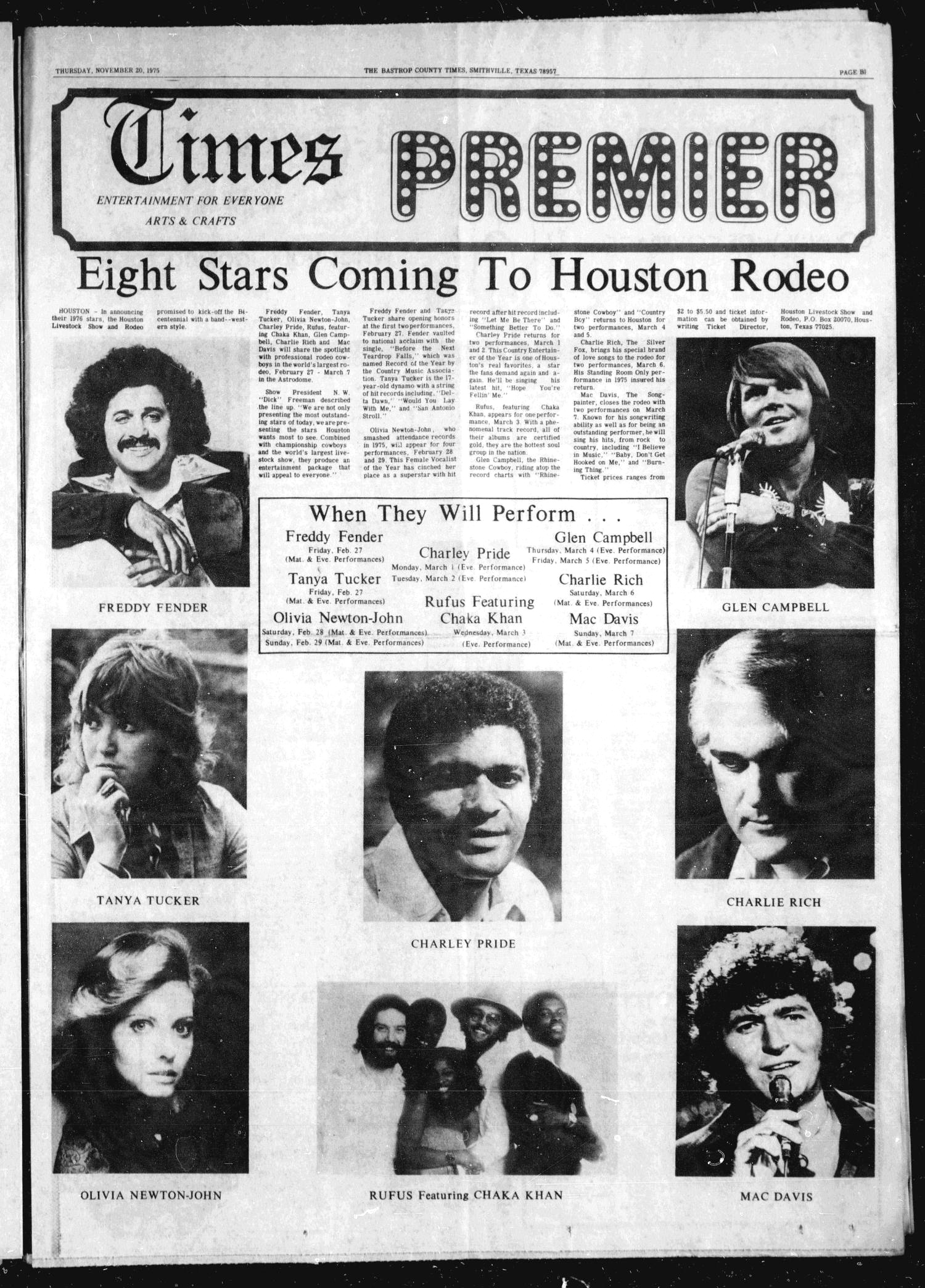 Freddy Fender, Tanya Tucker, Olivia Newton-John. Charley Pride, Rufus, featuring Chaka Khan, Glen Campbell, Charlie Rich and Mac Davis will share the spotlight with professional rodeo cowboys in the world's largest rodeo, February 27 March 7 in the Astrodome.