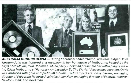 Also at the reception, Olivia was awarded with gold and platinum albums. Pictured (l-r) are: Ross Barlow, managing director of Polygram Records Australia; Allan Hely, managing director of Festival Records; Newton-John; and Rockman.