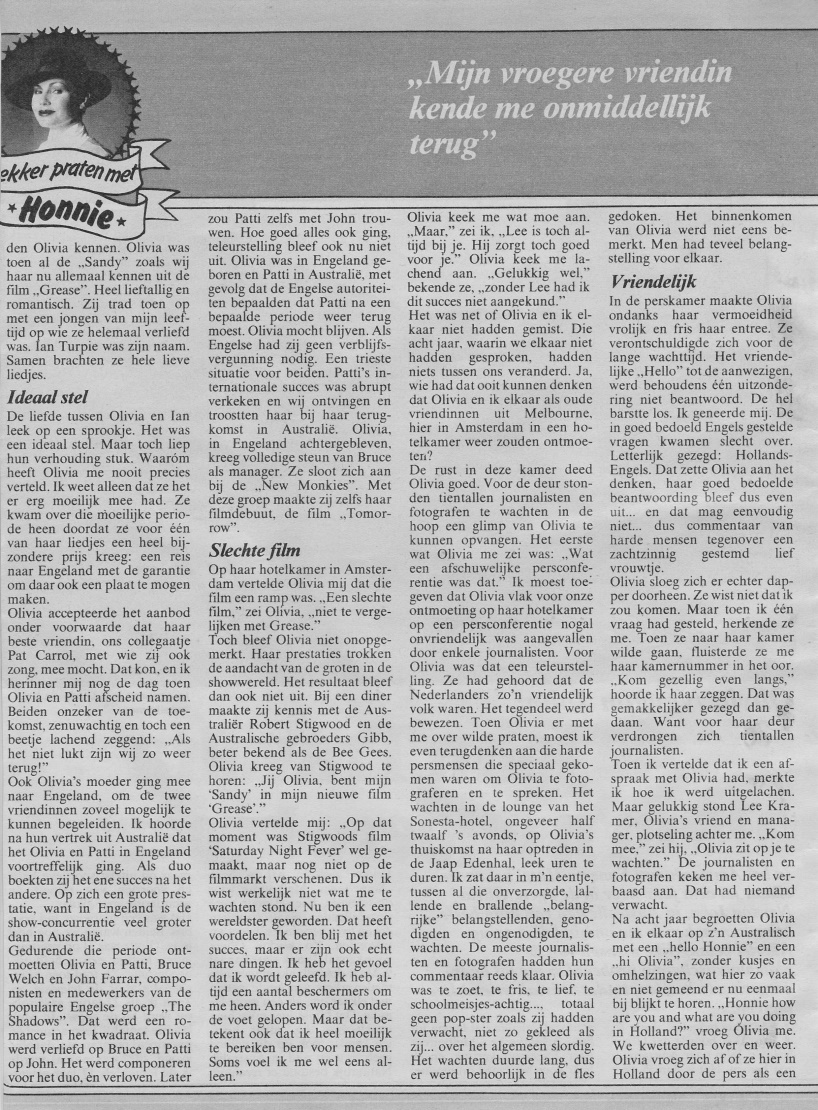 Olivia told me: At that time, Stigwood's film 'Saturday Night Fever' had been made, but hadn't yet been released. So I really didn't know what to expect. Now I've become a world star. That has its advantages. I'm happy with the success, but there are also some really bad things. I feel like I'm being lived. I always have a few protectors around me. Otherwise, I'd be trampled. But that also means I'm very difficult for people to reach. Sometimes I feel lonely.