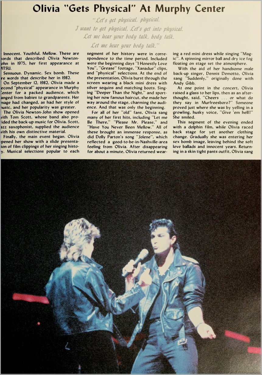 Innocent. Youthful. Mellow. These are words that described Olivia Newton~John in 1975, her first appearance at MTSU.