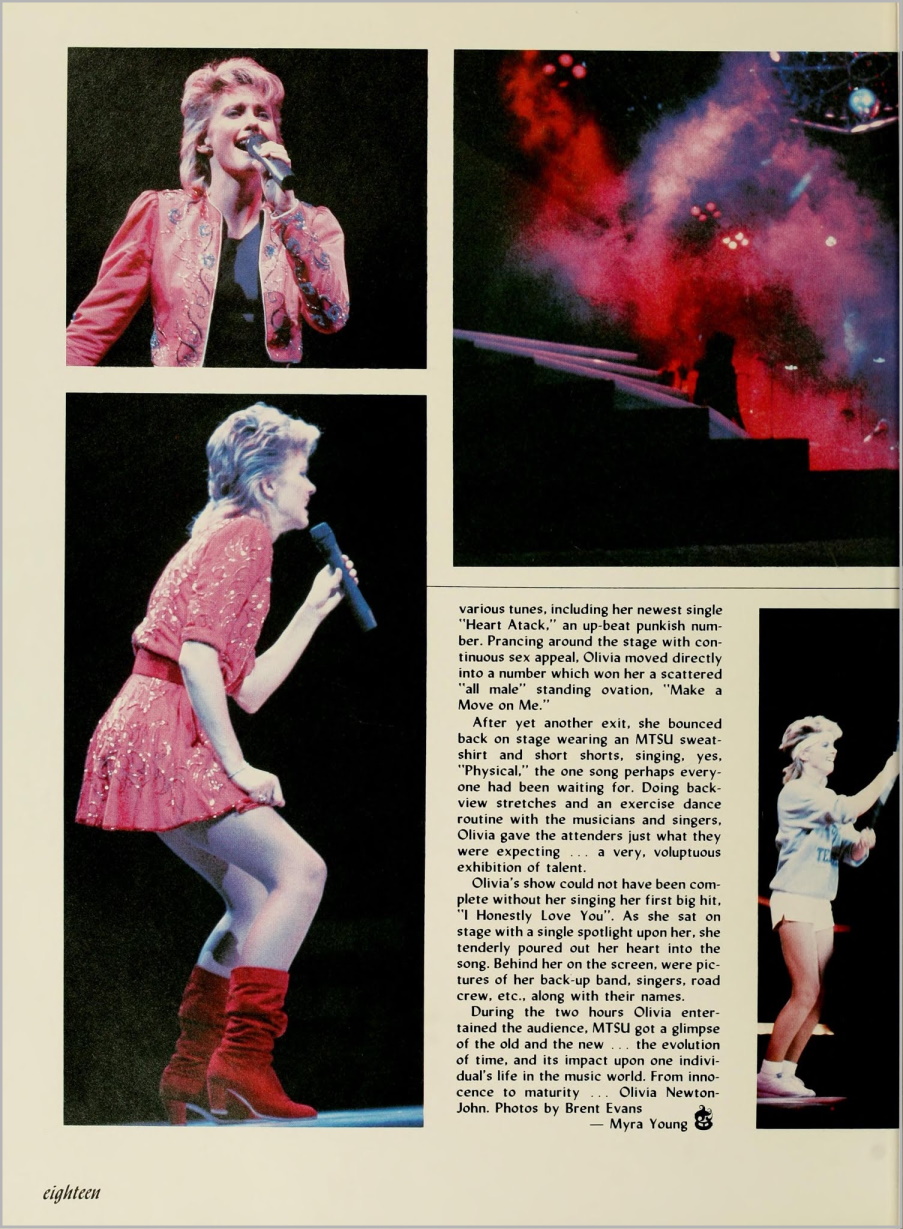 During the two hours Olivia entertained the audience. MTSU got a glimpse of the old and the new .. . the evolution of time. and its impact upon one individual's life in the music world. From innocence to maturity Olivia Newton-John.