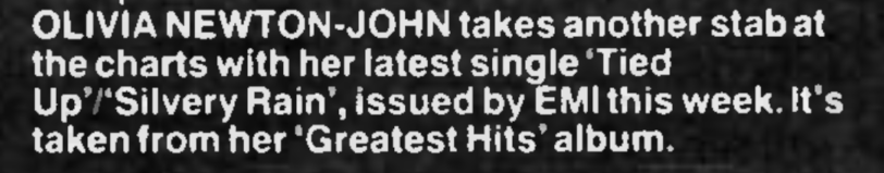 OLIVIA NEWTON-JOHN takes another stab at the charts with her latest single Tied Up/Silvery Rain