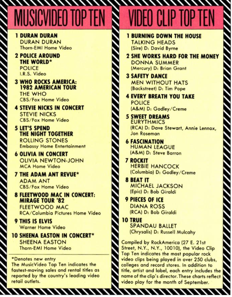 The Music Video Top Ten indicates the fastest-moving sales and rental titles as reported by the country's leading video retail outlets.