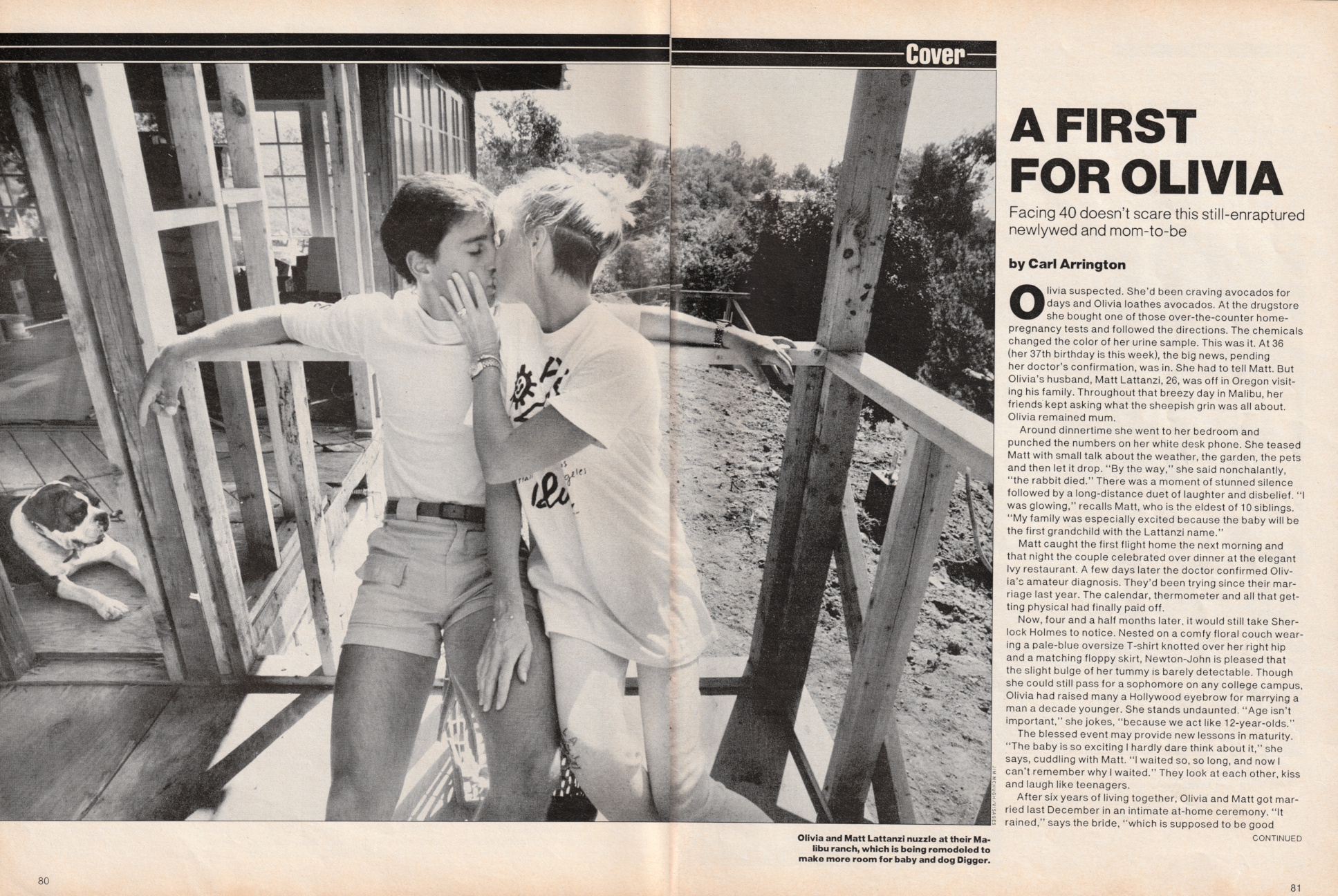 At 36 (her 37th birthday is this week), the big news, pending her doctor's confirmation, was in. She had to tell Matt. But Olivia's husband, Matt Lattanzi, 26, was off in Oregon visiting his family. Throughout that breezy day in Malibu, her friends kept asking what the sheepish grin was all about. Olivia remained mum.