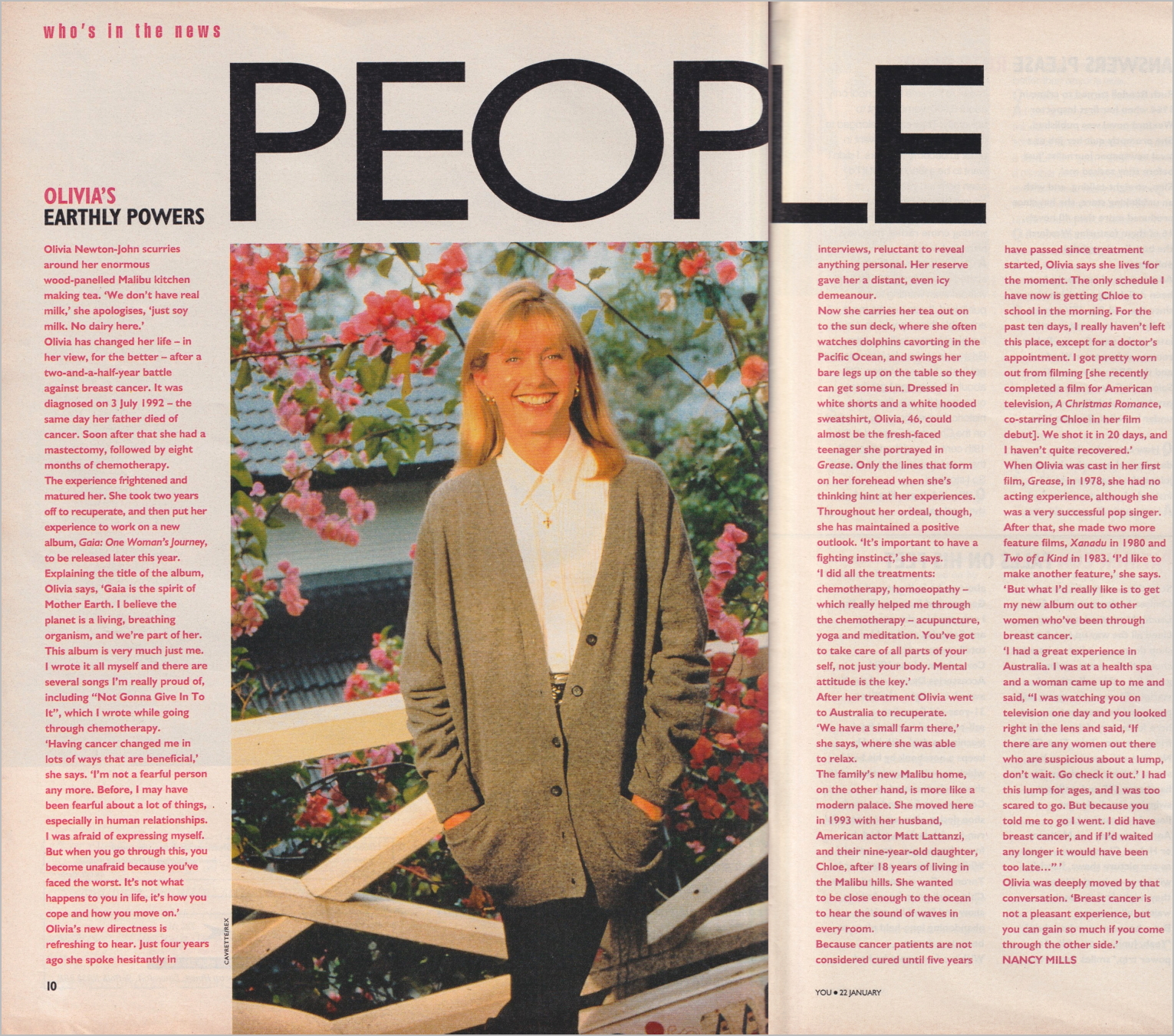 Olivia has changed her life — in her view, for the better - after a two-and-a-half-year battle against breast cancer. It was diagnosed on 3 July 1992, the same day her father died of cancer. Soon after that she had a mastectomy, followed by eight months of chemotherapy.