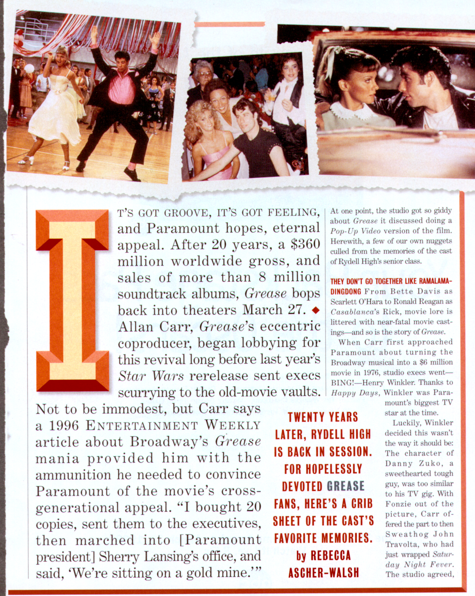 Not to be immodest, but Carr says a 1996 ENTERTAINMENT WEEKLY article about Broadway's Grease mania provided him with the ammunition he needed to convince Paramount of the movie's cross-generational appeal. I bought 20 copies, sent them to the executives, then marched into [Paramount president] Sherry Lansing's office, and said, We're sitting on a gold mine.
