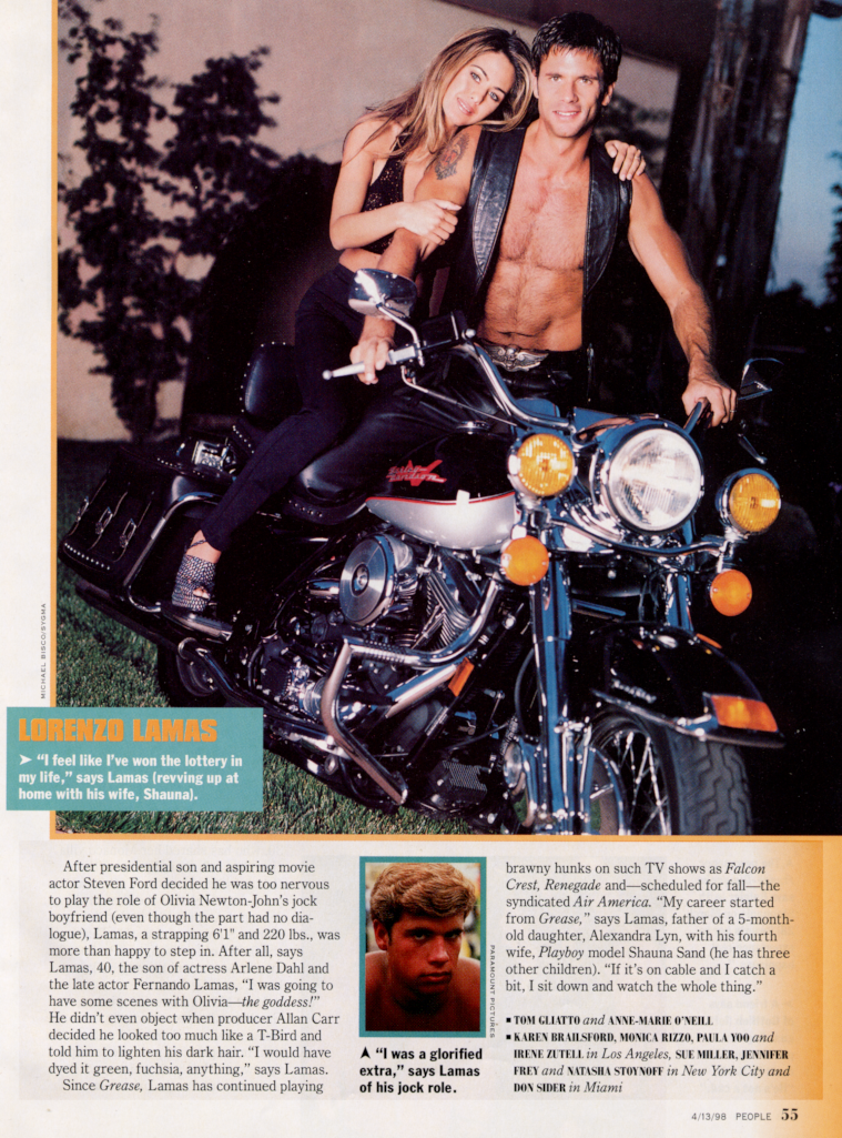 Lorenzo Lamas - After presidential son and aspiring movie actor Steven Ford decided he was too nervous to play the role of Olivia Newton-John's jock boyfriend (even though the part had no dialogue), Lamas, a strapping 6'1" and 220 lbs., was more than happy to step in. After all, says Lamas, 40, the son of actress Arlene Dahl and the late actor Fernando Lamas, I was going to have some scenes with Olivia the goddess!