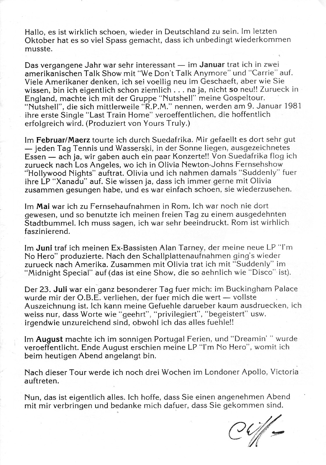 Olivia did not join Cliff for this tour. However, Cliff has always been an absolute gent to Olivia, and he mentions duetting with Olivia on Suddenly and getting featured in her Hollywood Nights TV Special in what he had been up to in the runup to this tour.
