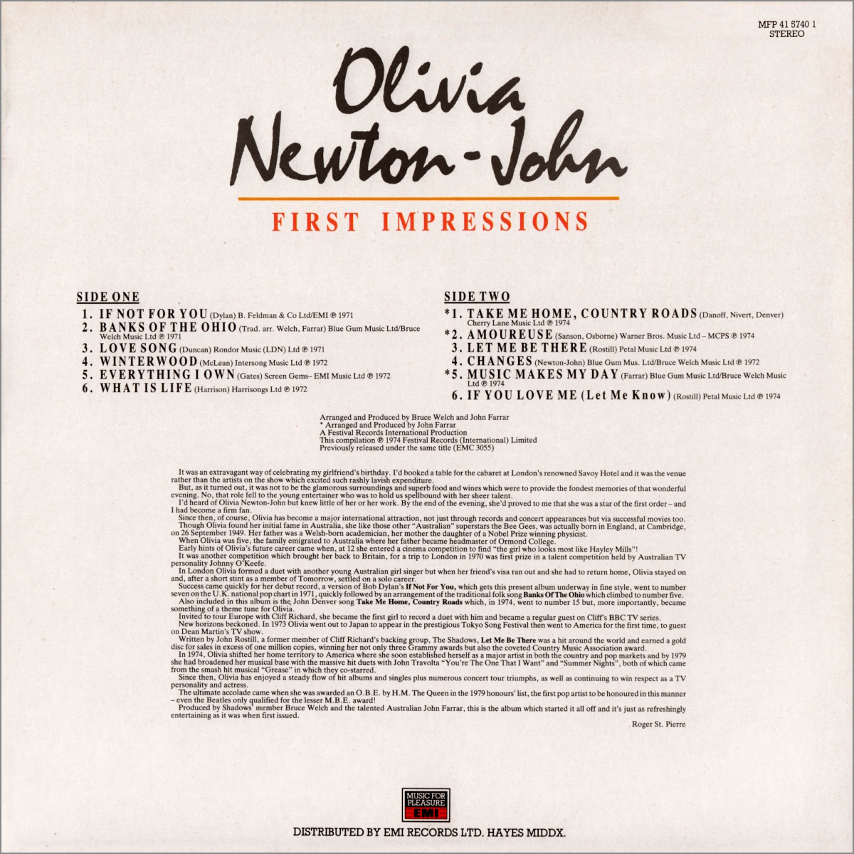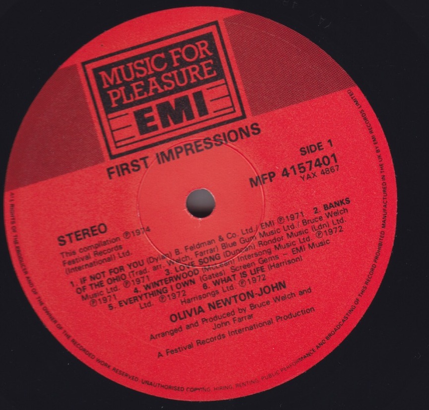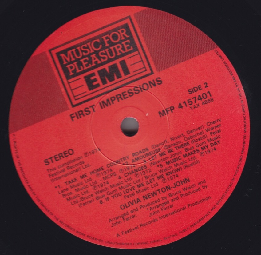 Olivia's 1974 First Impressions record re-released in the UK in 1985 on EMI Music For Pleasure red label with a lovely new cover.