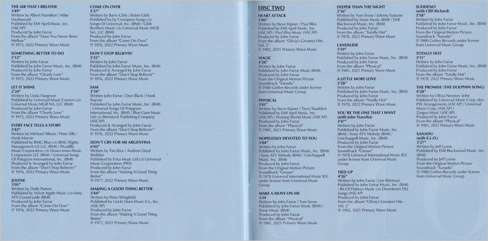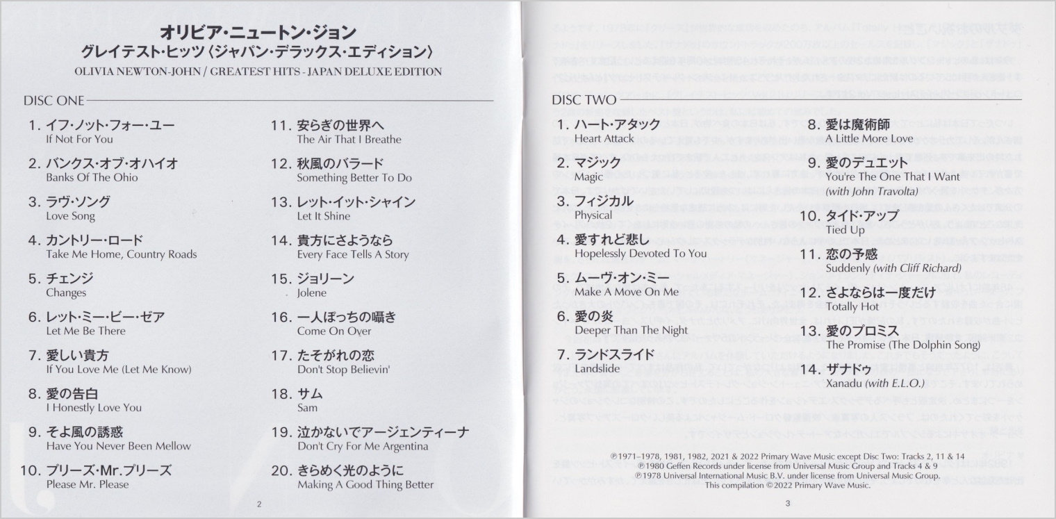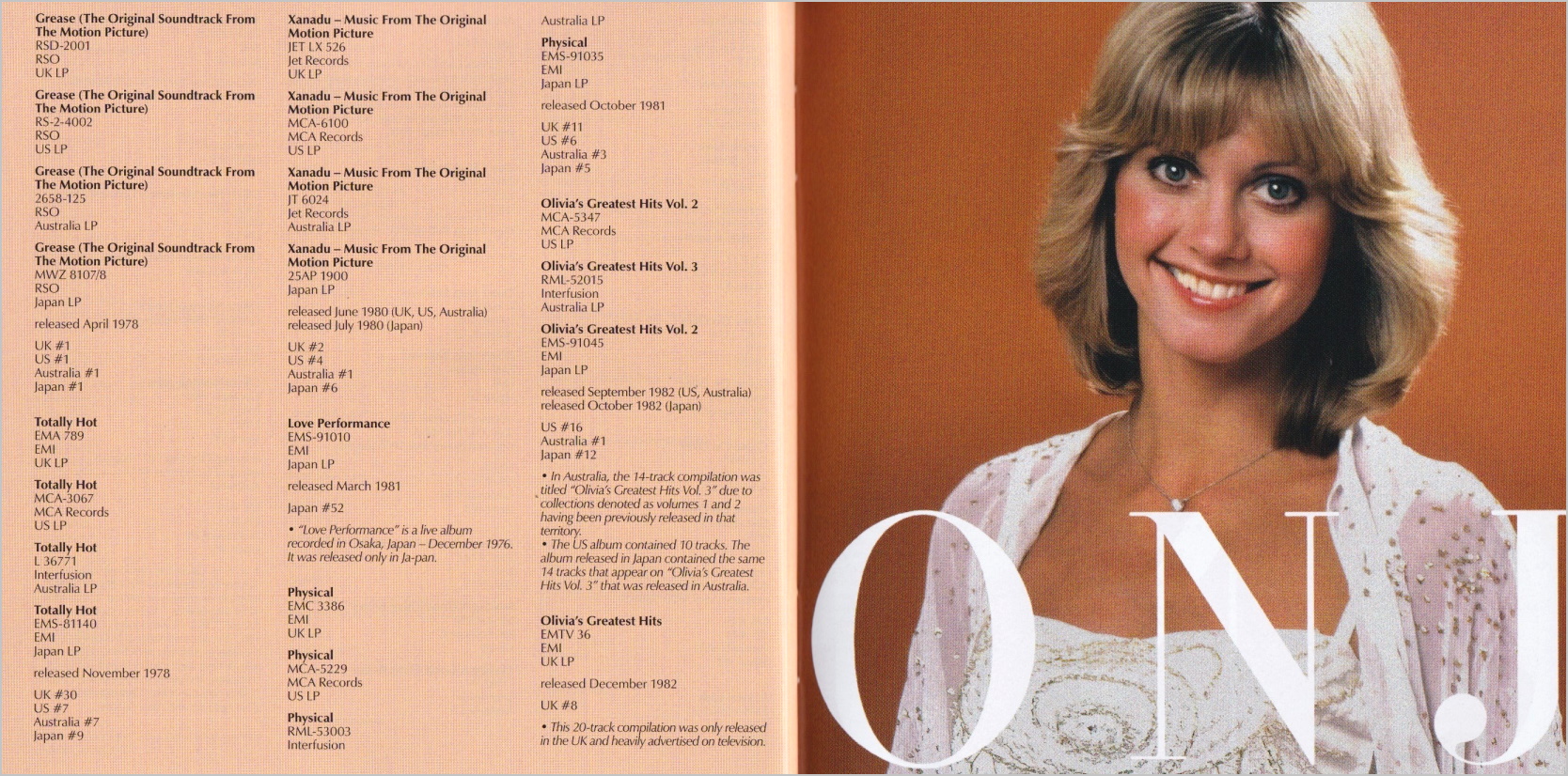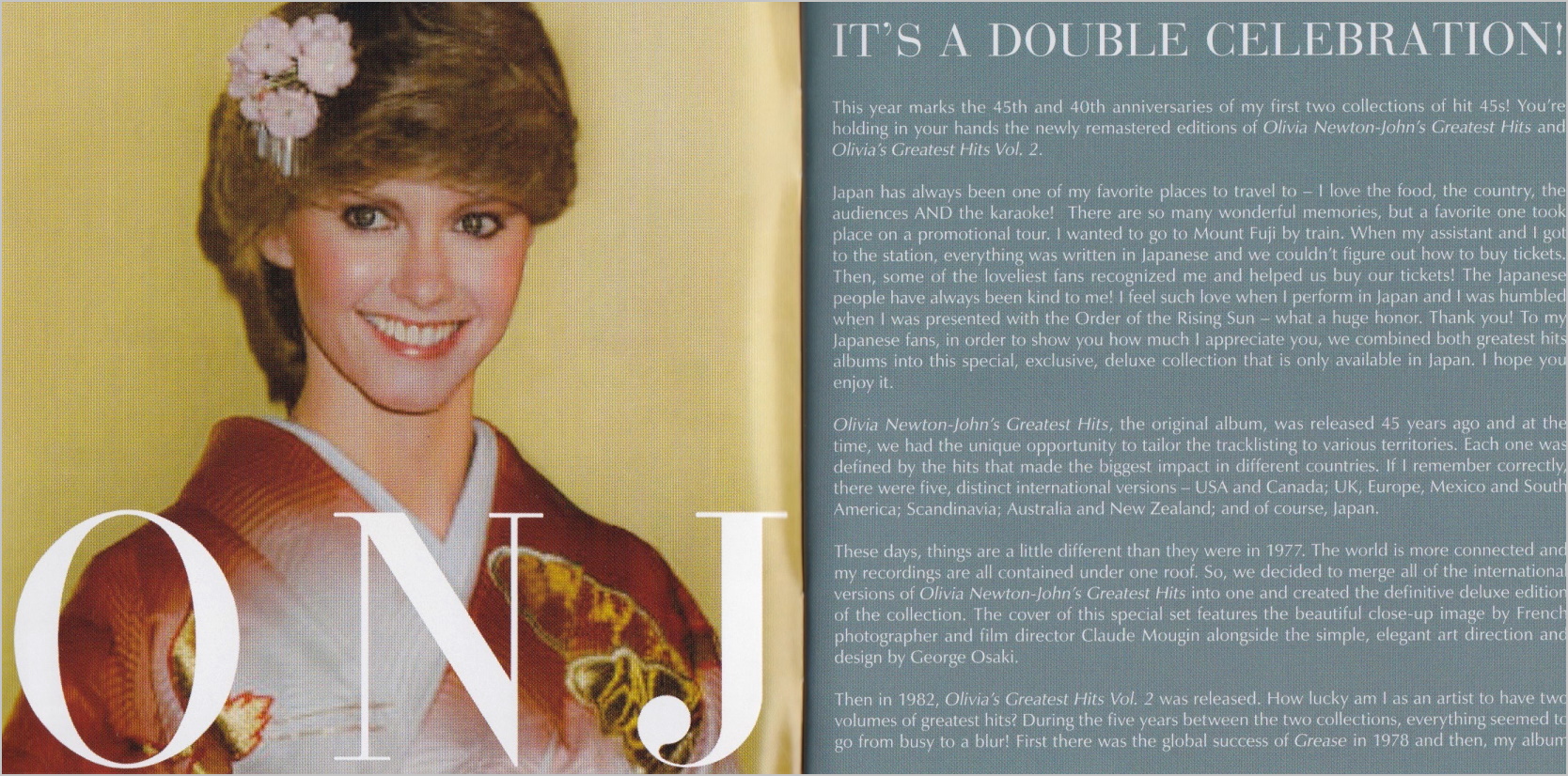 Olivia's Japanese record label combines both of Olivia's Greatest Hits compilations. This release incorporates all the tracks from the various 1977/1978 Greatest Hits releases in North America, Europe, Japan, Australia and South America plus a second CD of Olivia's hits from 1978-1982, with the tracks from the original Greatest Hits Volume 2 releases.