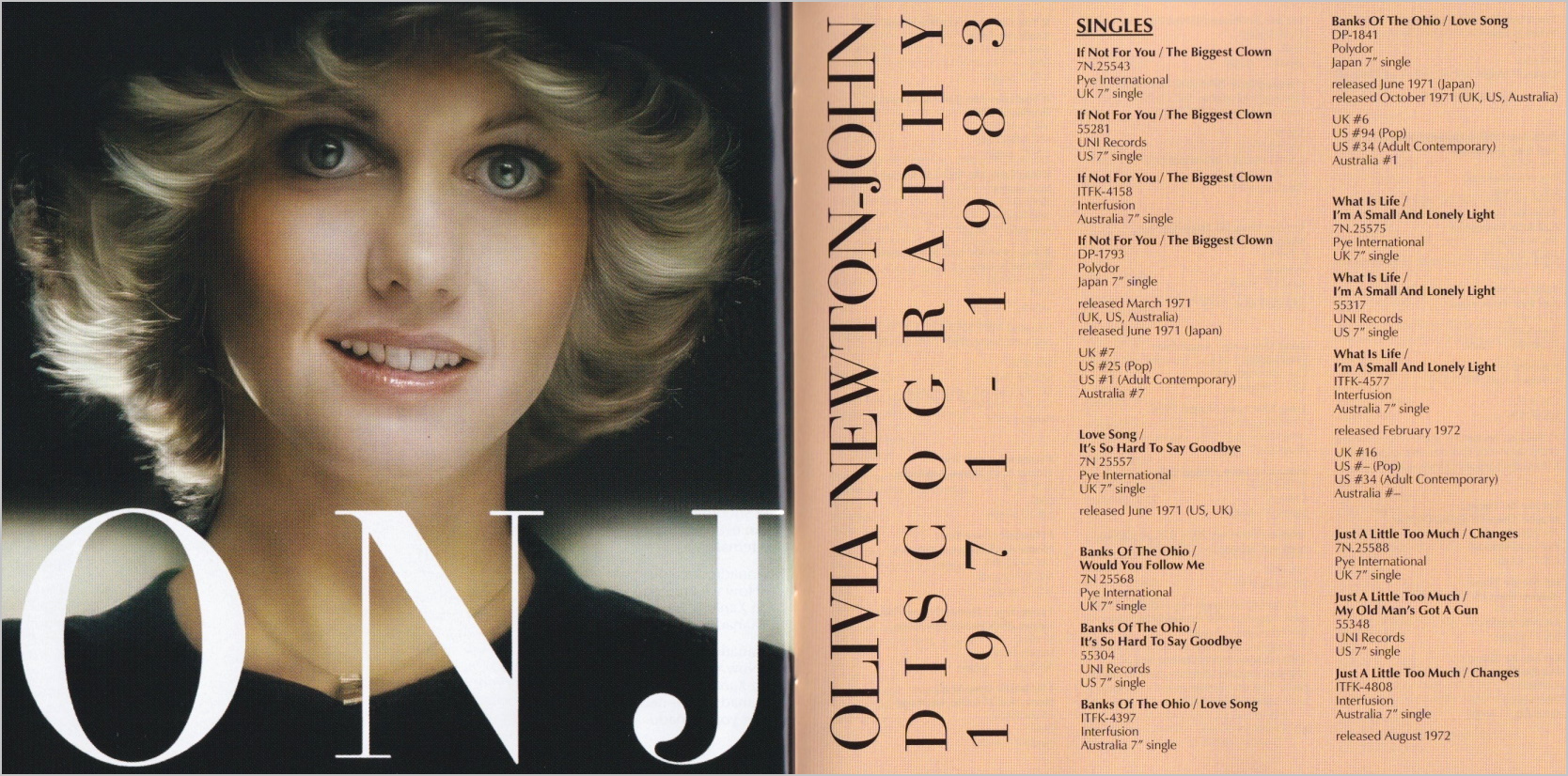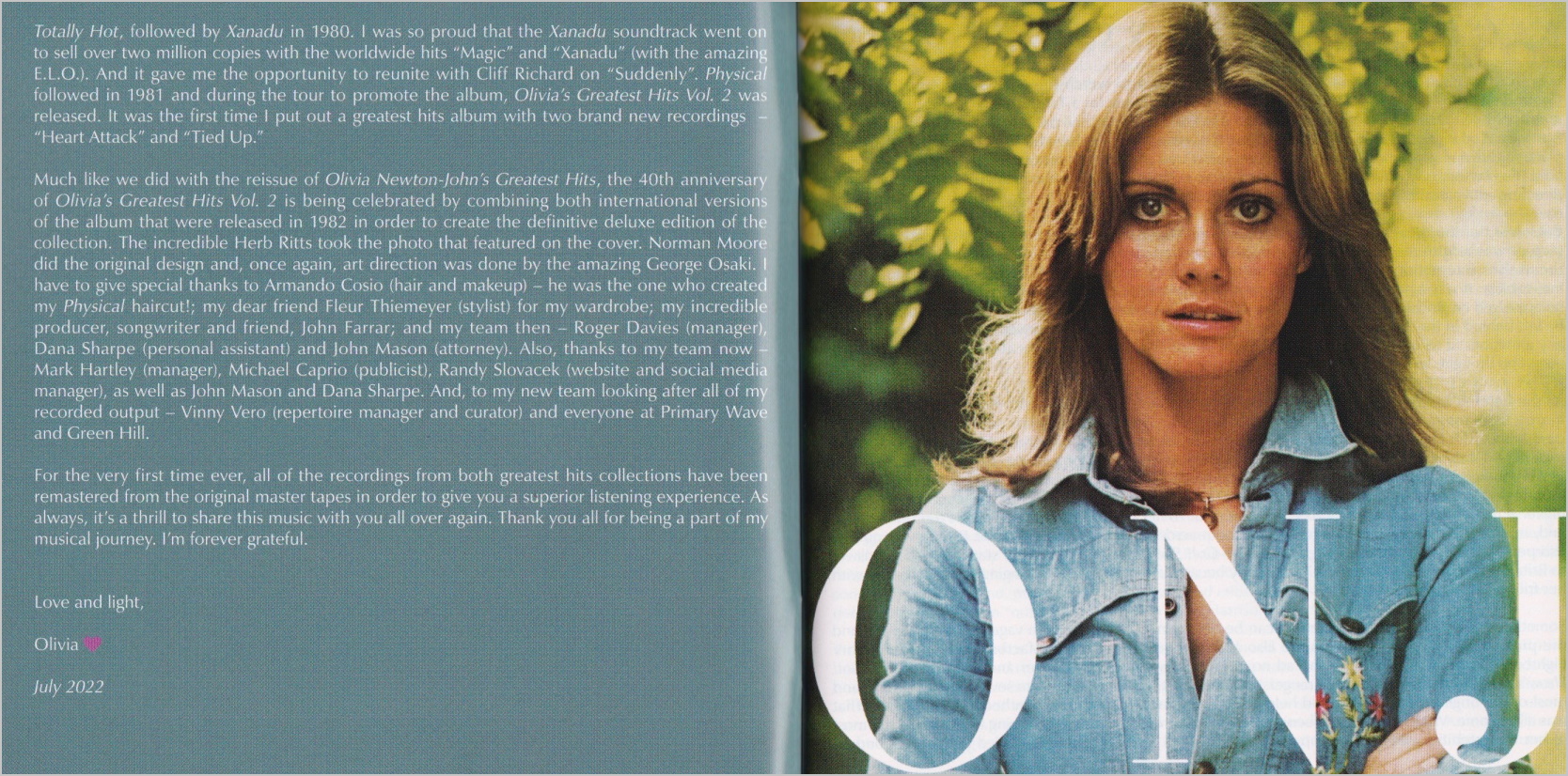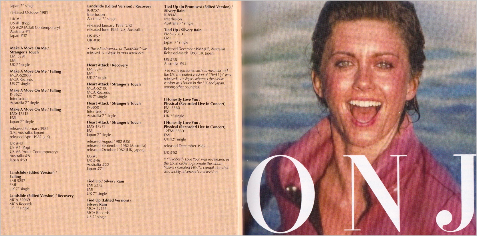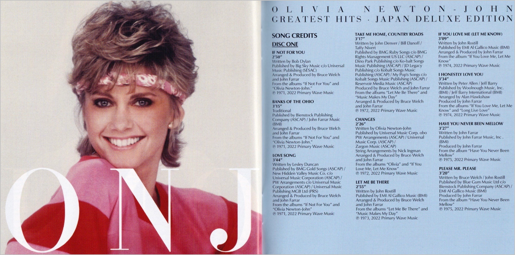 Olivia's Japanese record label combines both of Olivia's Greatest Hits compilations. This release incorporates all the tracks from the various 1977/1978 Greatest Hits releases in North America, Europe, Japan, Australia and South America plus a second CD of Olivia's hits from 1978-1982, with the tracks from the original Greatest Hits Volume 2 releases.