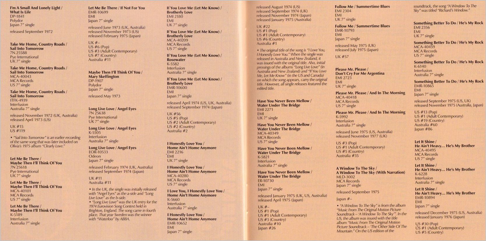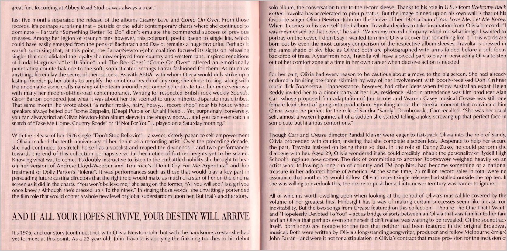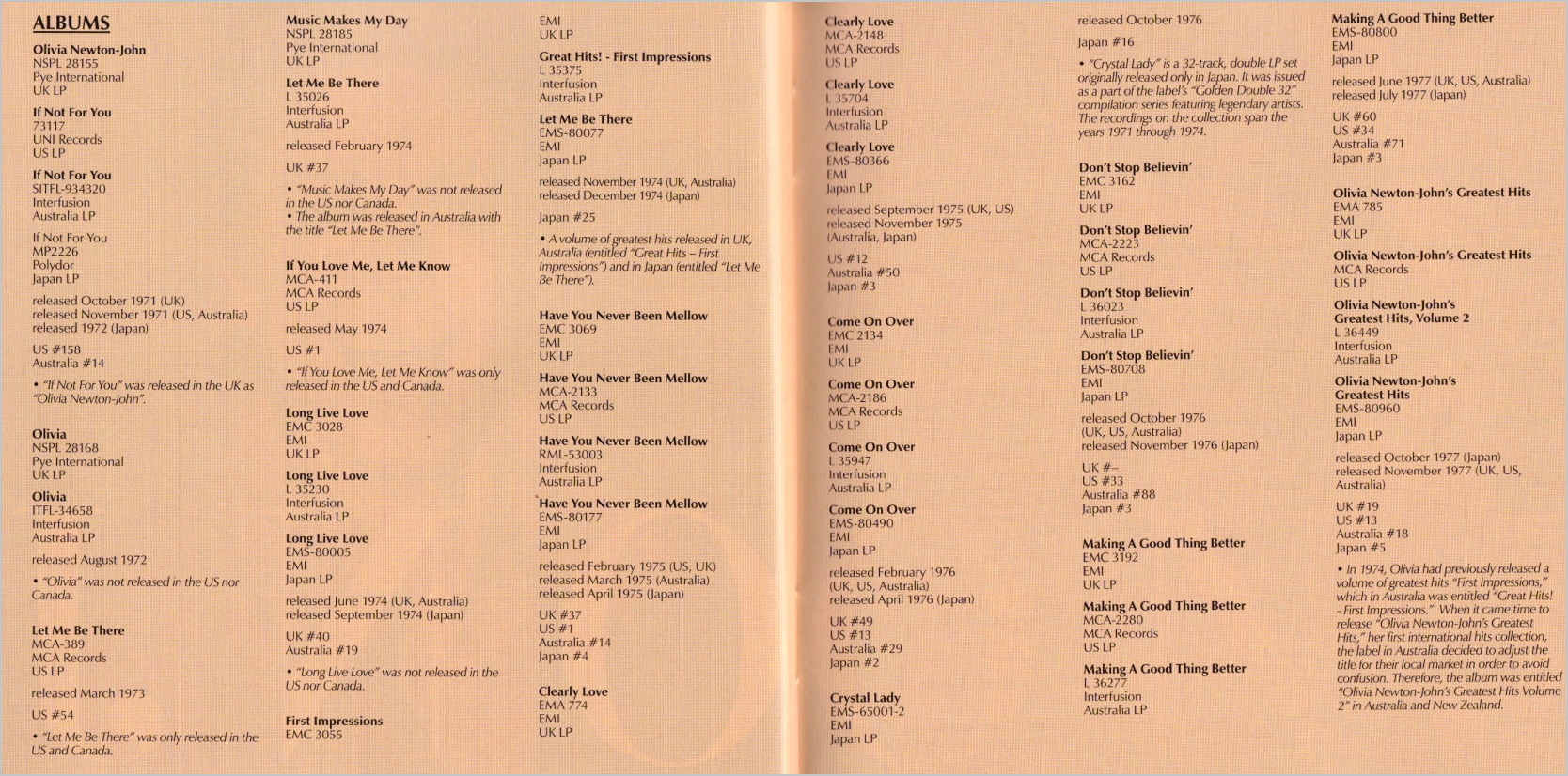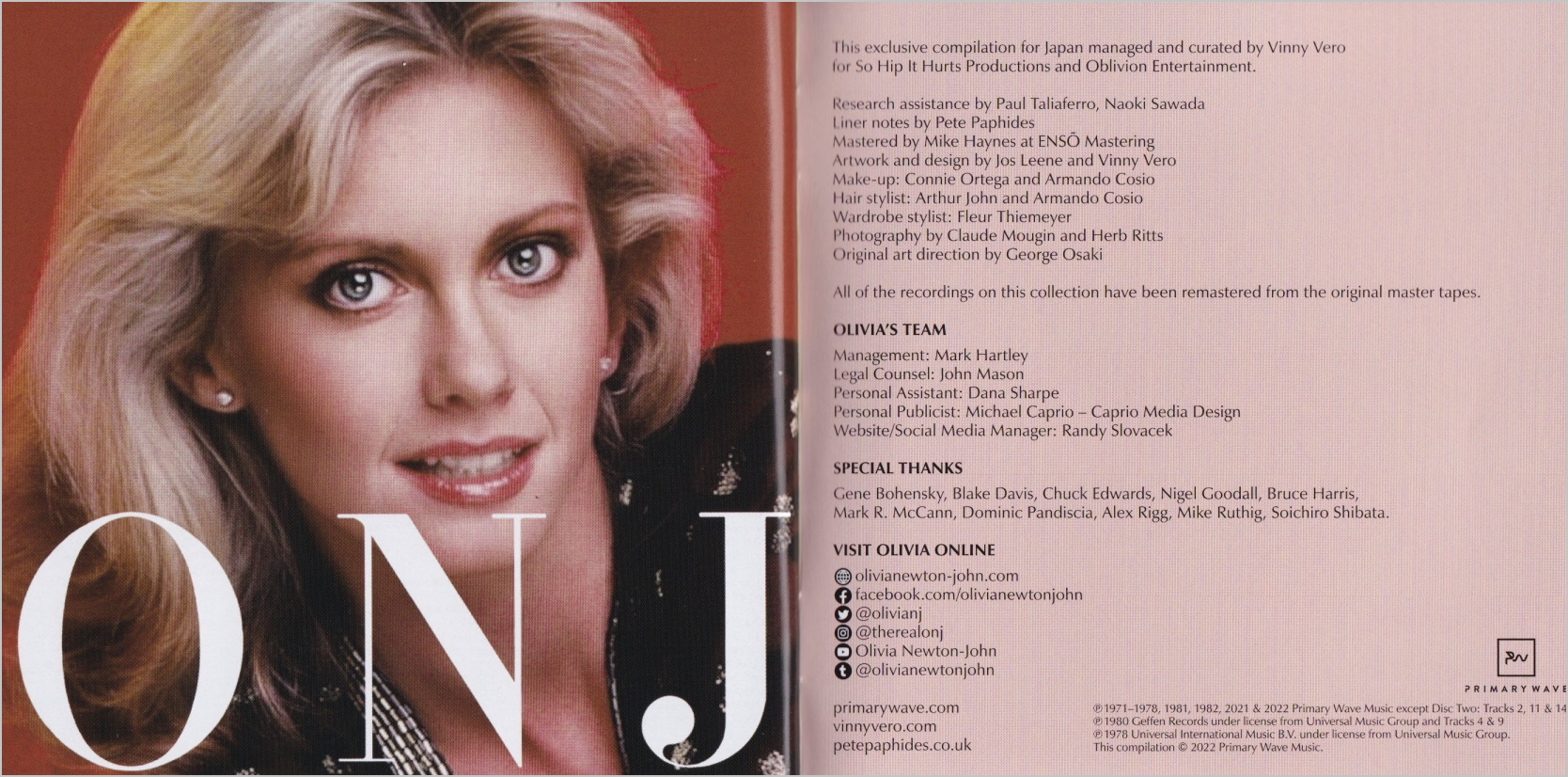 Olivia's Japanese record label combines both of Olivia's Greatest Hits compilations. This release incorporates all the tracks from the various 1977/1978 Greatest Hits releases in North America, Europe, Japan, Australia and South America plus a second CD of Olivia's hits from 1978-1982, with the tracks from the original Greatest Hits Volume 2 releases.