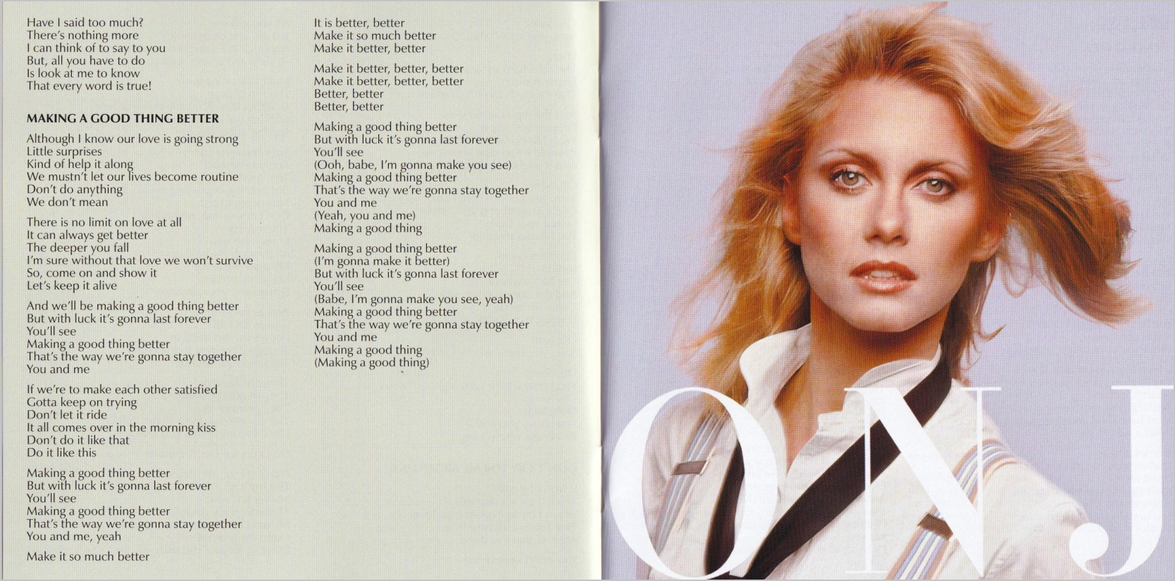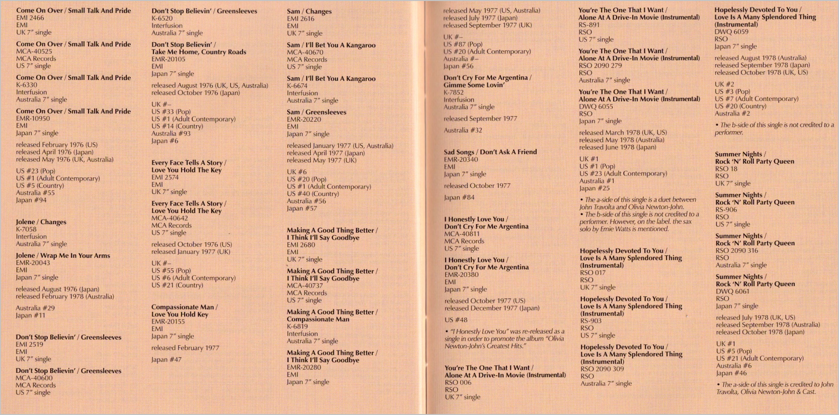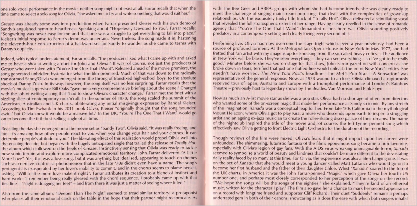 The booklet is similar to the US release but with edition of the lyrics translated into Japanese, more photos and the bio covering the Grease and Physical era. A lovely extra is Olivia's personal message to her Japanese fans. The Japanese release also comes with a double sided poster, unfortunately folded in four to fit in the CD case. The CDs come in a sturdy plastic double CD case, whereas the USA/European versions are in a cardboard digipack which I always feel could easily tear.