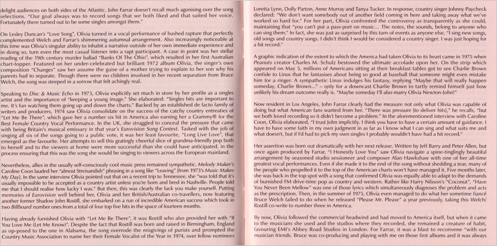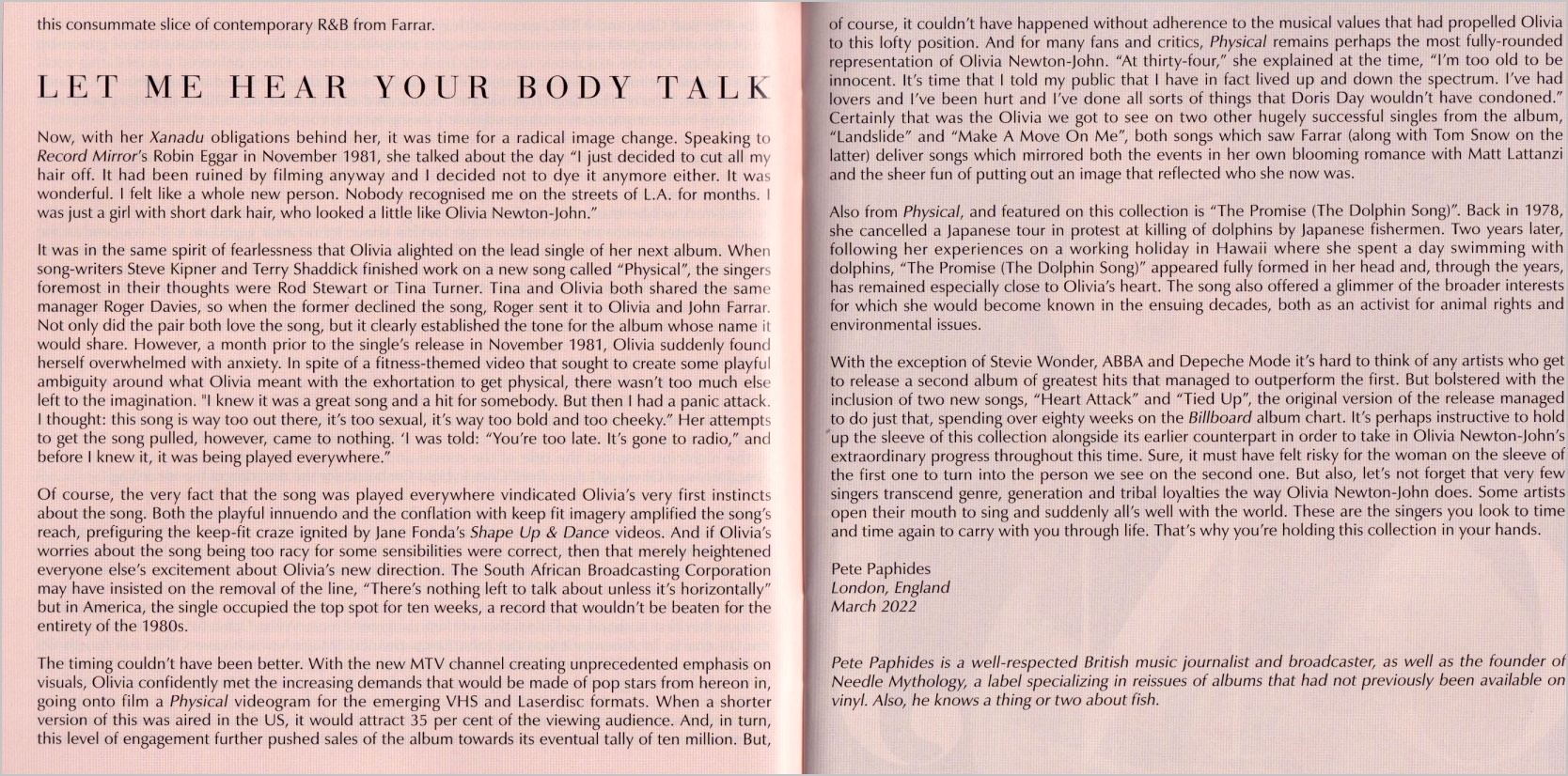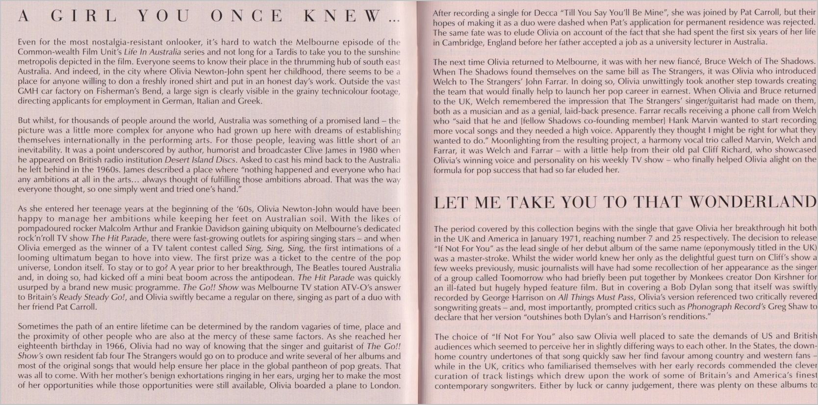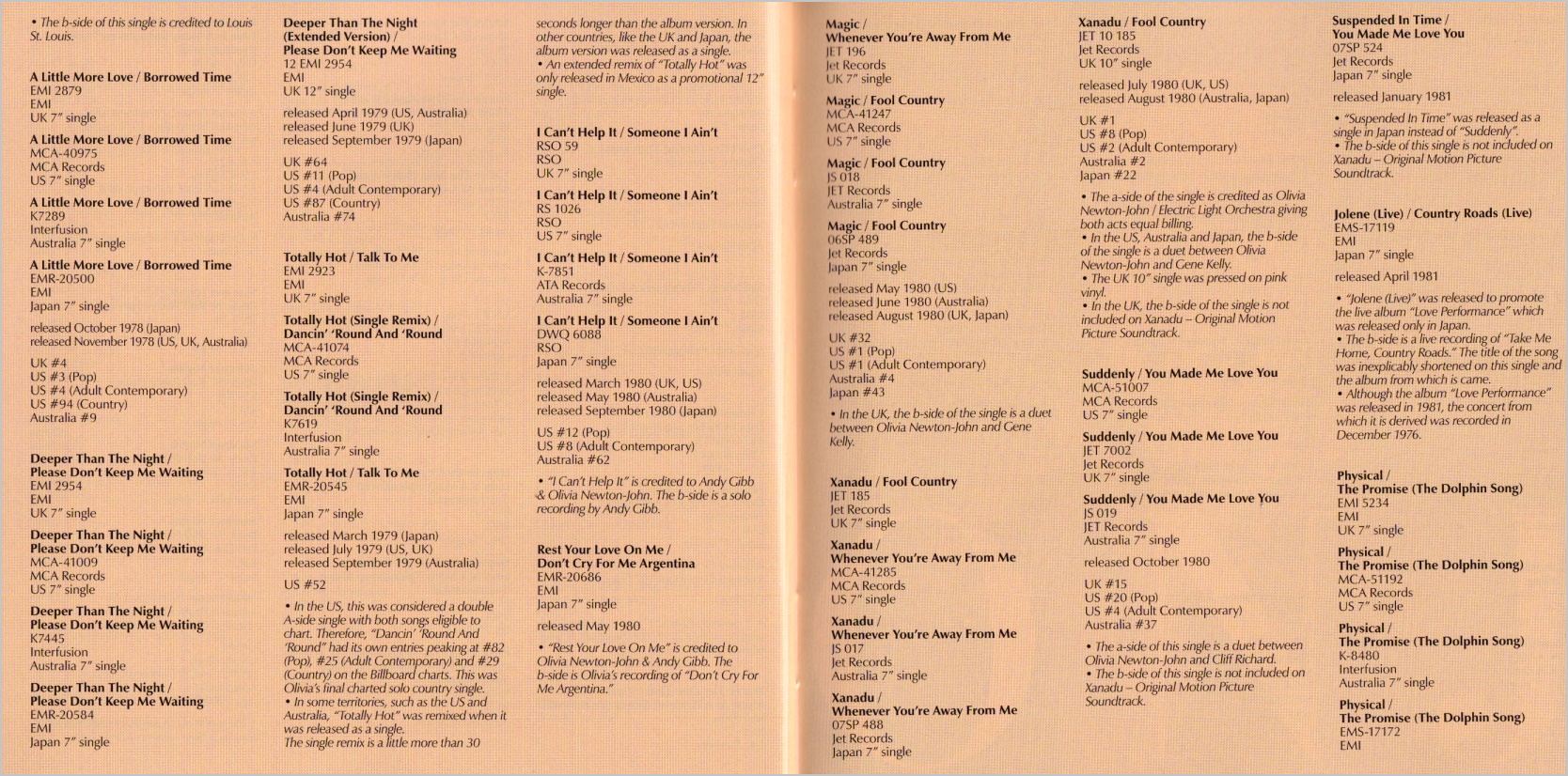 The booklet is similar to the US release but with edition of the lyrics translated into Japanese, more photos and the bio covering the Grease and Physical era. A lovely extra is Olivia's personal message to her Japanese fans. The Japanese release also comes with a double sided poster, unfortunately folded in four to fit in the CD case. The CDs come in a sturdy plastic double CD case, whereas the USA/European versions are in a cardboard digipack which I always feel could easily tear.