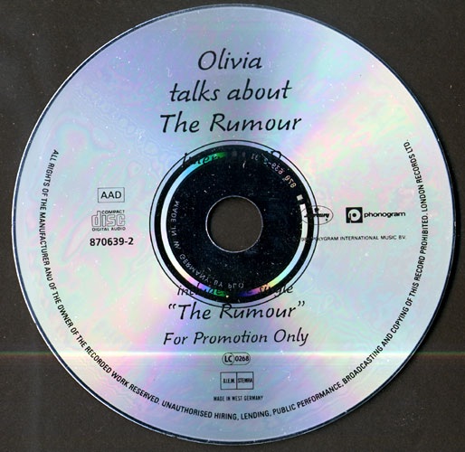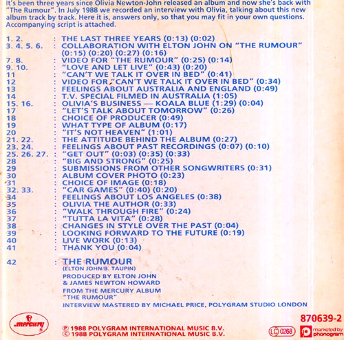 This album remains a favorite amongst fans. Very different from previous albums it remains alongside Gaia as one of the most personal. After a self-imposed three year album gap it was welcomed with open arms by fans but despite international promotion and lots of TV appearances sales weren't as good as expected. No one can deny that the title track with its sexy, upbeat video deserved to be a hit. This CD interview disc is of UK origin and like the Back With A Heart interview the actual questions are absent from the CD.