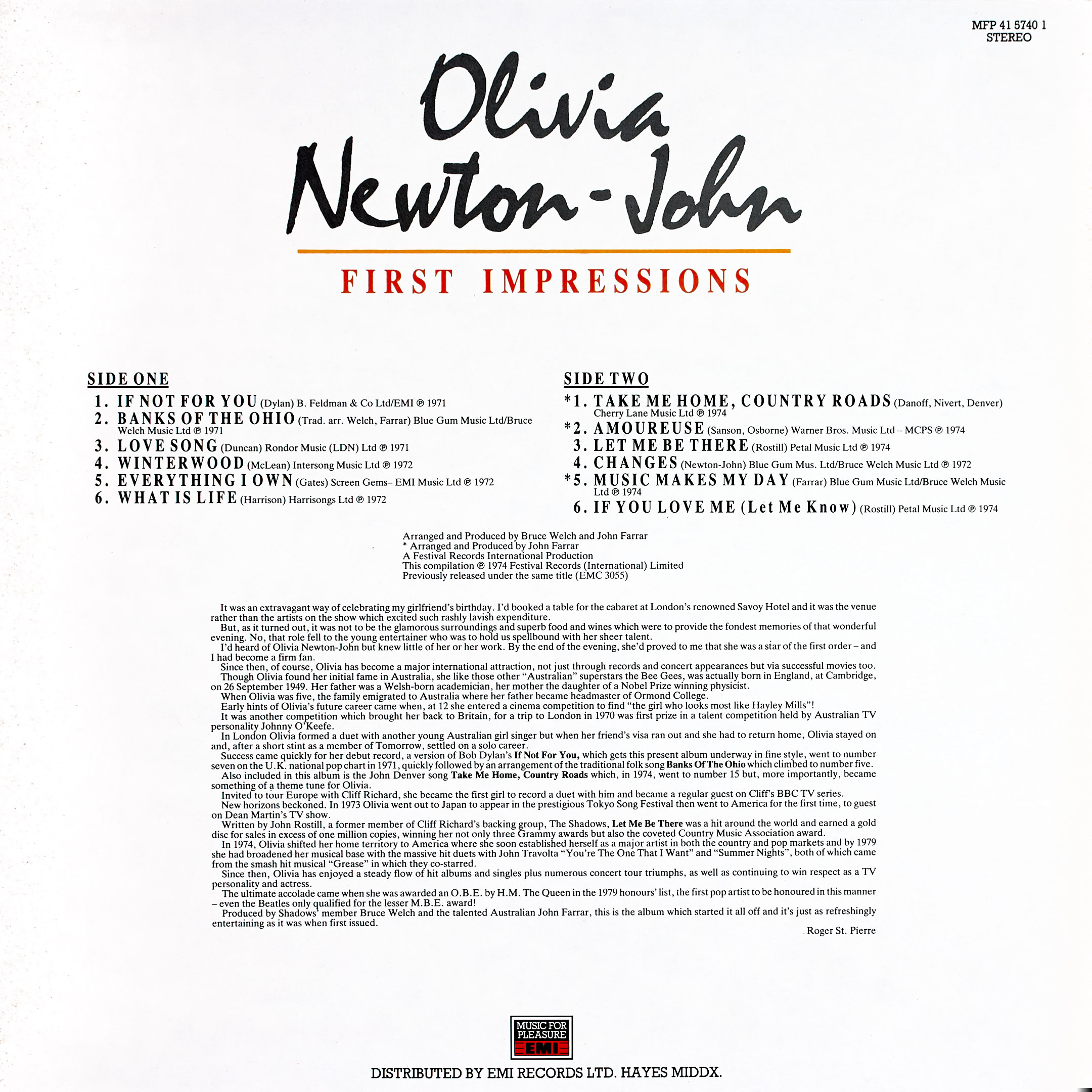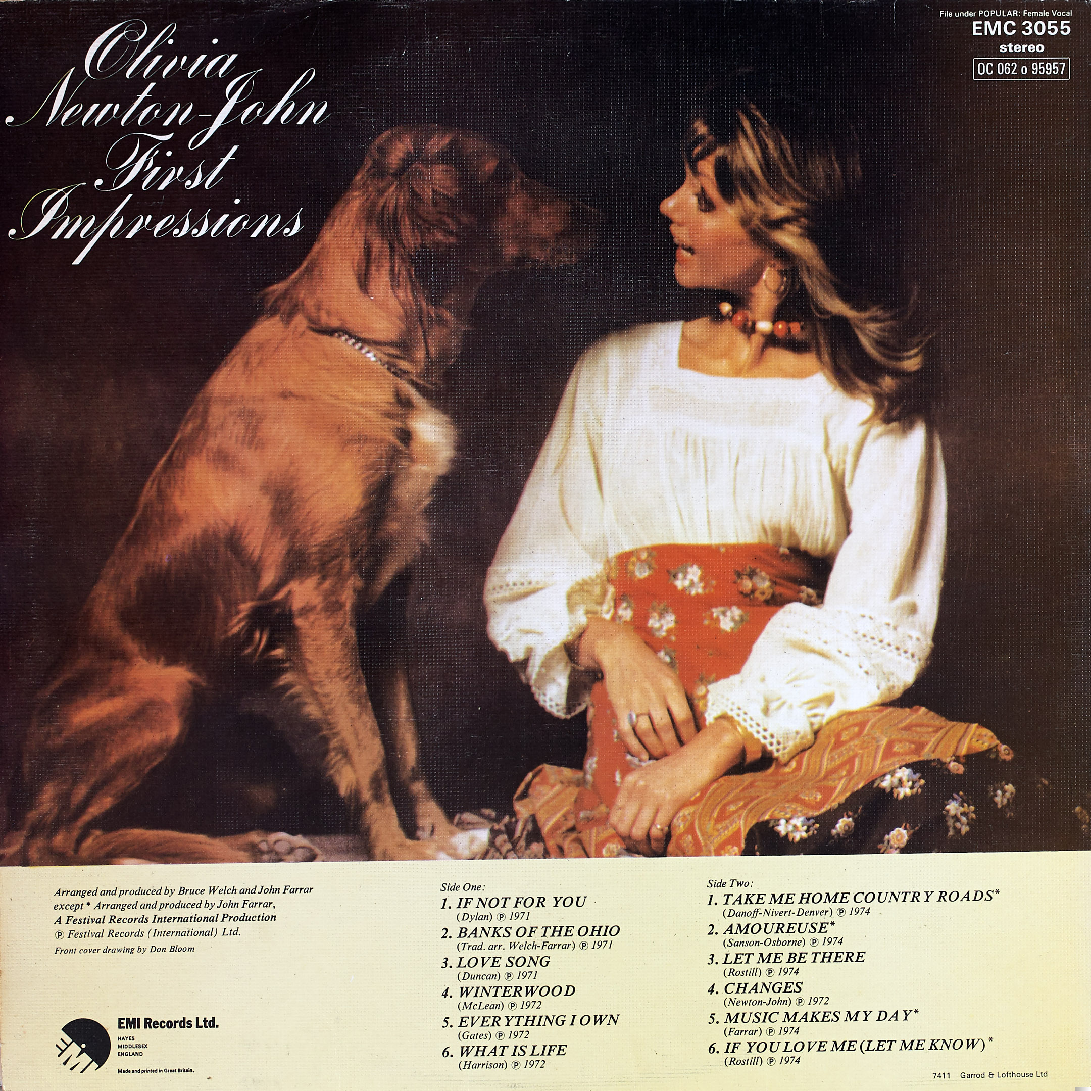 Olivia moved from Pye to EMI in the UK in 1974, before she represented the UK in the Eurovision Song Contest. This compilation was released by EMI in that year. A slightly different track selection but the same artwork by Don Bloom was released in Australia as Greatest Hits, the Australians have been off-by-one with numbering Olivia's Greatest Hits albums ever since. EMI were a bit more circumspect because Olivia didn't really have enough hits to justify the Greatest Hits label, so this was titled First Impressions. Nevertheless there were five hits on it - If Not For You, Banks of the Ohio, Take Me Home Country Roads, Let Me Be There and If You Love Me Let Me Know.