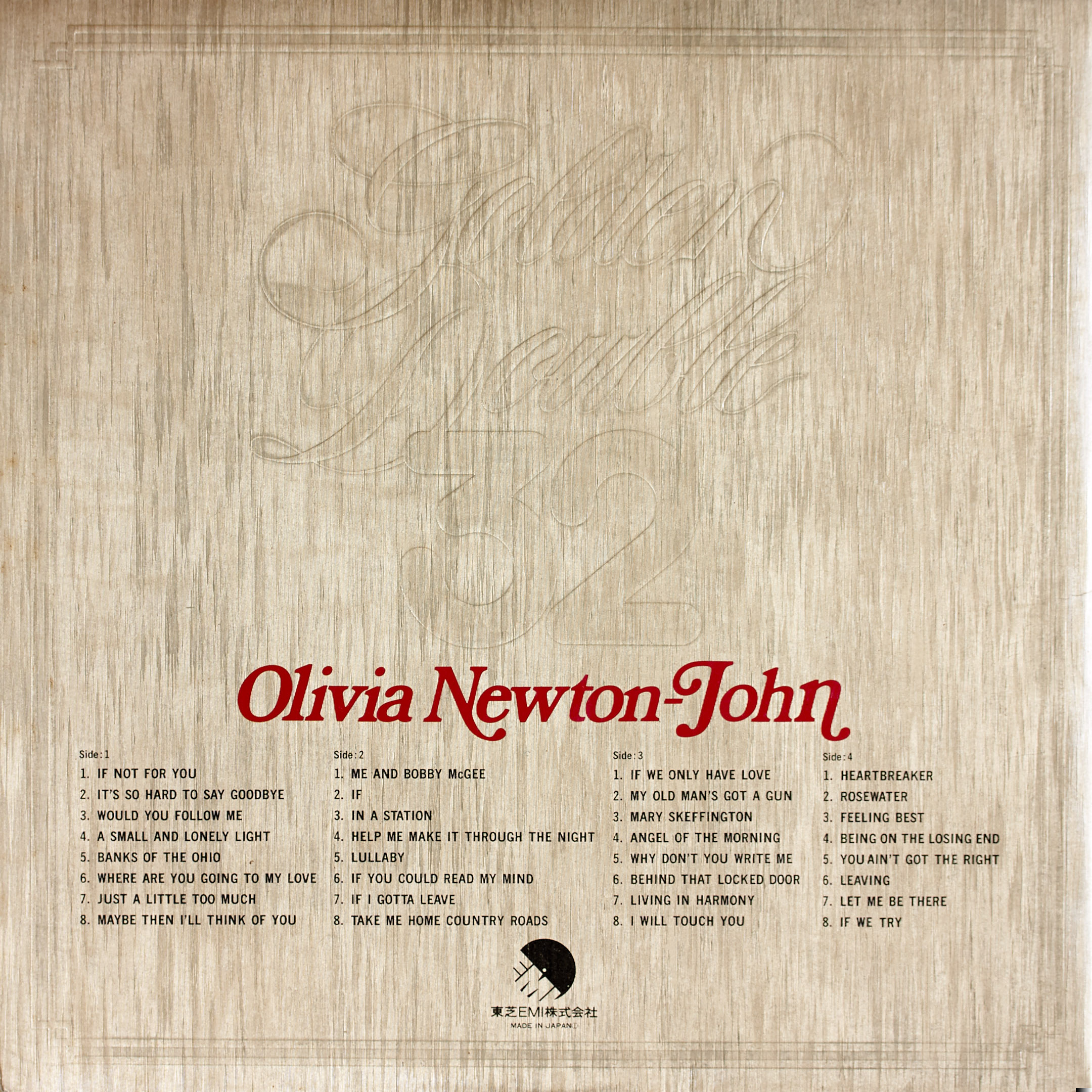 Lovely Japanese compilation, drawn from Olivia's first three albums. It was the only way to get many of these tracks in the 1980s, and served me very well for a many years until the release of the double CD 48 Original tracks by EMI in the mid-1990s.