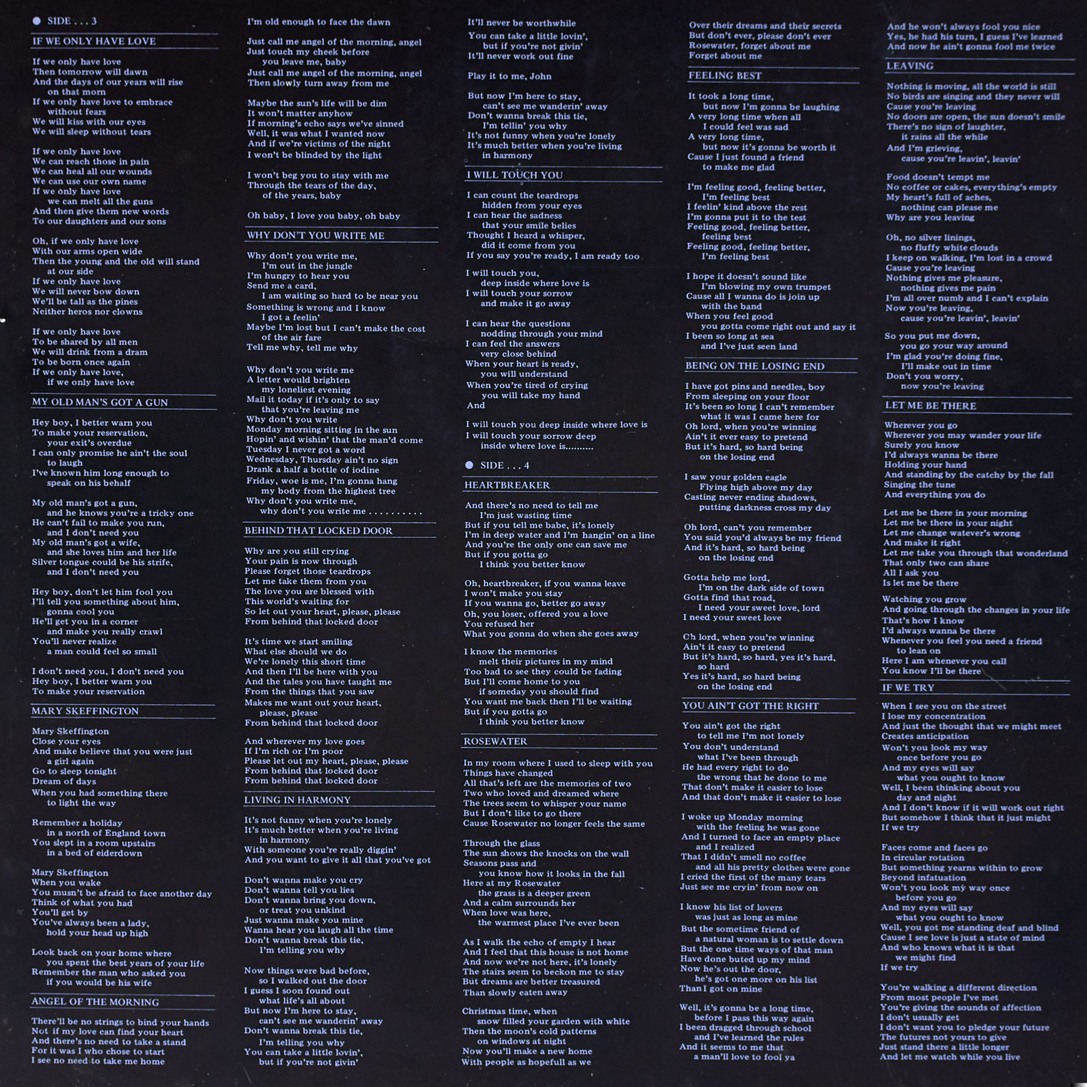 The two record inner sleeves had the artwork from Olivia's second LP, Olivia and the lyrics.