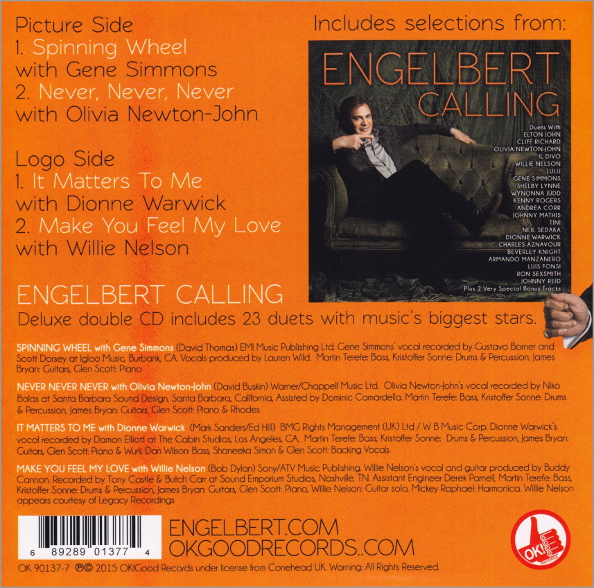 This Duet EP includes Never, Never, Never the duet by Engelbert Humperdinck and Olivia Newton-John along with three other Engelbert duets. All are taken from Engelbert Humperdinck's album Engelbert Calling.