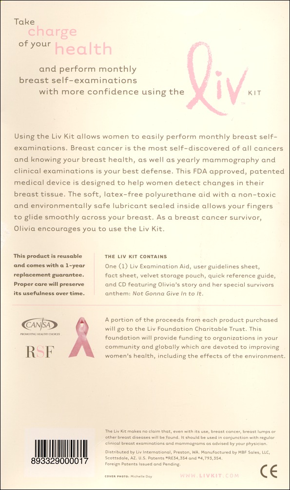 The kit includes full instruction leaflets and the aid. Included also is a 13 minute CD which includes a short introduction by Olivia and her "Not Gonna Give Into It" survivors' anthem and full instructions on how to use the aid by Dr. Dorcas McLennan. Visit the http://www.livkit.com Livkit website (ed dead link as of 2020) for more details and how to order.