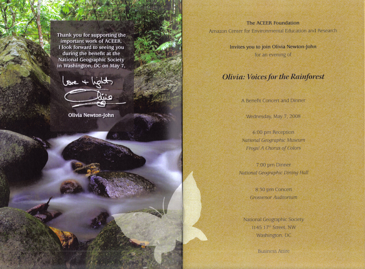 Olivia will give a benefit concert, with a reception and dinner proceeding it, on May 7, 2008 at the headquarters of the National Geographic Society.