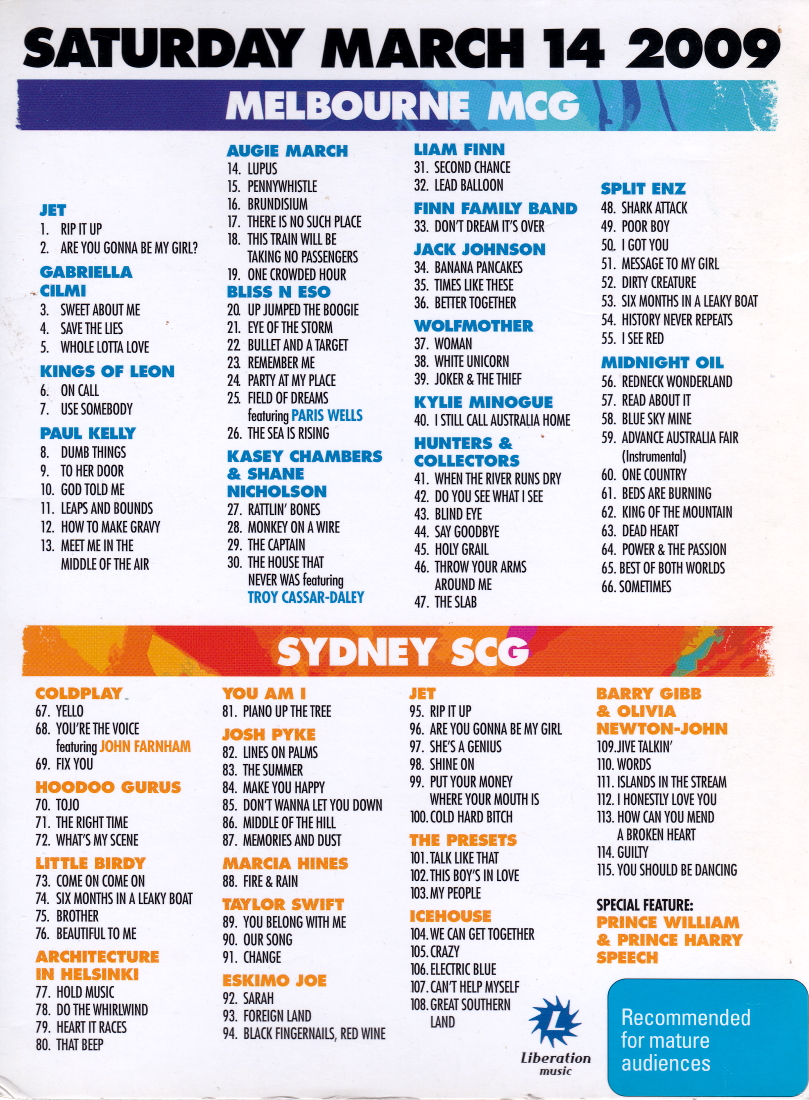 A four disc DVD of 9 hours of footage of the live performances at the March 14 2009 charity concerts in aid of the Australian Bush Fires and the Queensland flooding.