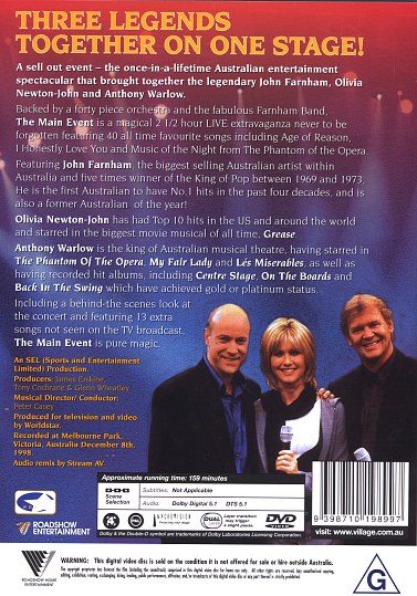 Recorded at Melbourne Park, Australia on December 8th 1998 as part of the Main Event concert tour, this features Olivia and Aussie giant John Farnham and Anthony Warlow live in concert! It was first released on video in 1999 and now available on DVD (same as the video but with Dolby Digital 5.1 and DTS 5.1 sound).